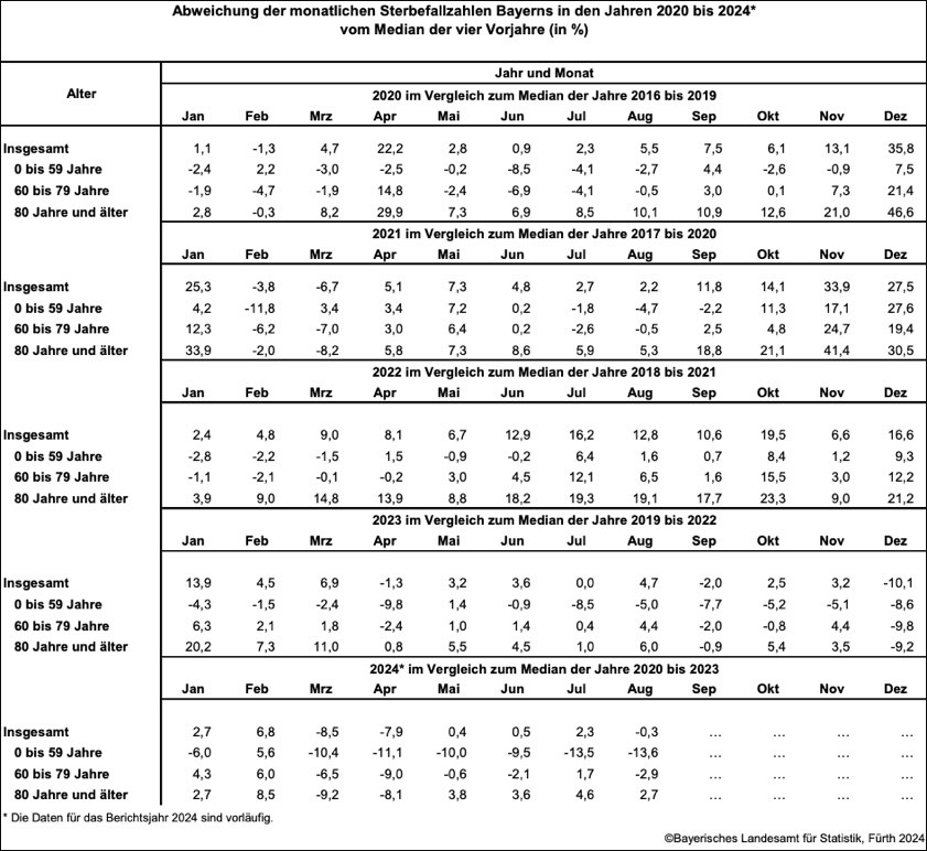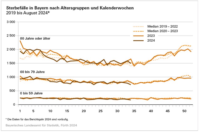 (ty) Wie das bayerische Landesamts für Statistik nach der Auswertung von vorläufigen Daten heute mitgeteilt hat, sind nach derzeitigem Stand im August dieses Jahres im Freistaat insgesamt 11 080 Menschen gestorben. Diese Zahl liegt nach Angaben der Behörde insgesamt auf dem Niveau des Medians* der Jahre 2020 bis 2023 (11 112 Verstorbene). Dabei sei allerdings zu beachten, "dass in die Berechnung des Medians der Jahre 2020 bis 2023 teilweise Jahre mit pandemie-bedingt hohen Sterbefall-Zahlen einfließen, wodurch der Vergleichswert für das Jahr 2024 relativ hoch ist".