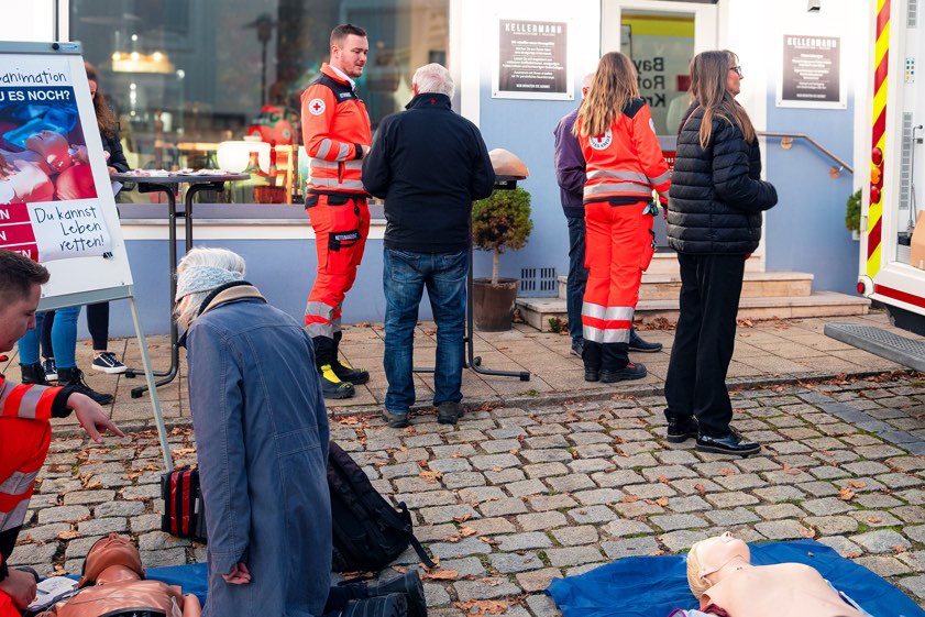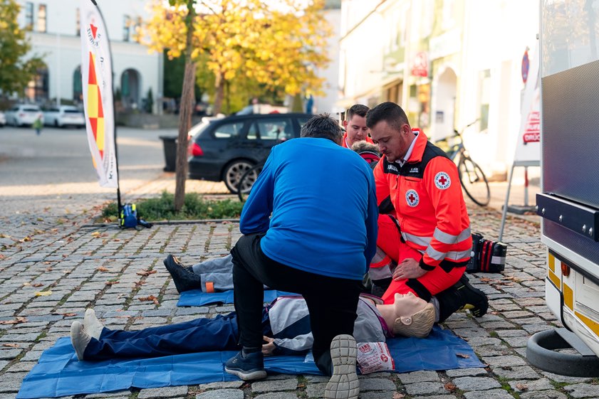 (ty) Als großen Erfolg wertet der BRK-Kreisverband von Pfaffenhofen seine Aktion, die er am Mittwoch am Marienplatz in Geisenfeld anlässlich des Welt-Reanimations-Tags veranstaltet hatte (Fotos). An zwei Übungspuppen hatten Passanten den Vormittag über die Gelegenheit, sich über Wiederbelebung zu informieren sowie unter der Anleitung von Rettungsdienst-Mitarbeitern auch die Herzdruck-Massage zu üben. "Die Resonanz war fantastisch und das Feedback der Bürgerinnen und Bürger war ausschließlich positiv", berichtet das Rote Kreuz.