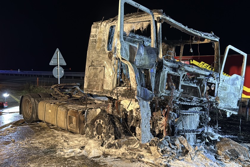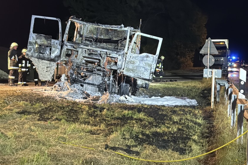 Kurz vor dem Autobahn-Dreieck platzte ein Reifen und geriet in Brand, Feuer griff aufs Führerhaus über. Anhänger konnte noch abgekoppelt werden.