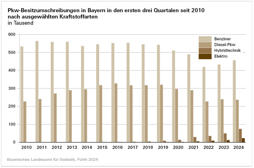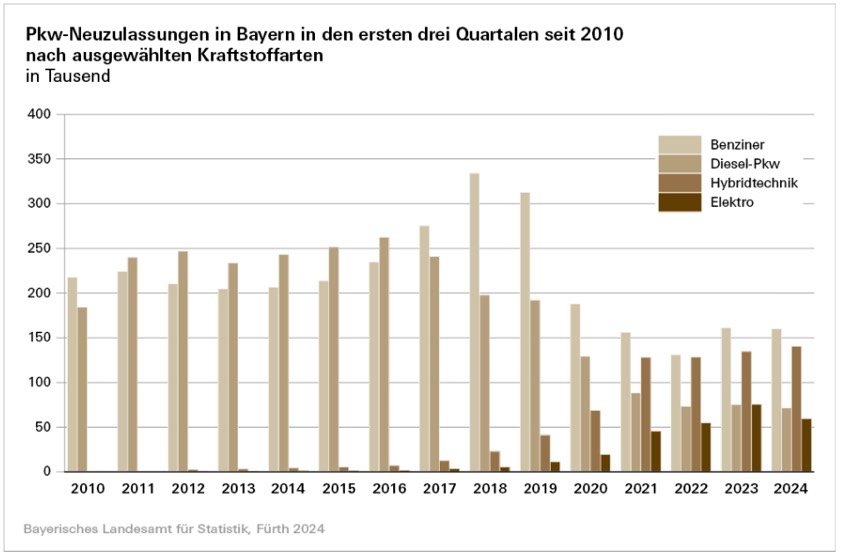 Im Ergebnis der ersten neun Monate dieses Jahres nutzen laut Landesamt für Statistik 53,5 Prozent der neu zugelassenen Pkw einen konventionelle Verbrennungs-Antrieb; davon werden 160 242 Pkw mit Benzin (minus 0,7 Prozent) und 71 552 mit Dieselkraftstoff (minus 4,8 Prozent) angetrieben. Bei den alternativen Antriebsarten verzeichnete die reine Elektro-Technik (BEV) mit einem Minus von 21,5 Prozent auf 59 305 Pkw den stärksten Rückgang gegenüber dem Vorjahres-Zeitraum. In der Hybrid-Technik lagen die Zahlen um 4,5 Prozent über denen des Vorjahres-Zeitraums. Hierin enthalten sind auch Plug-In-Fahrzeuge, die mit 24 834 Pkw einen Zuwachs um 4,8 Prozent verzeichneten.