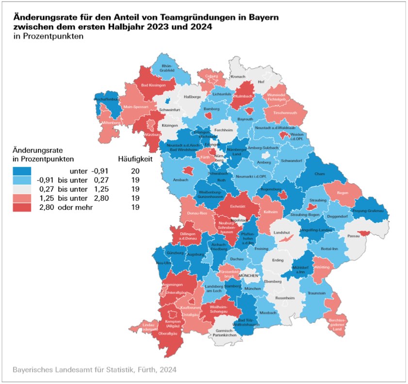 In der Kartendarstellung lässt sich das obere Fünftel der Landkreise und kreisfreien Städte Bayerns mit einer besonders deutlichen Zunahme von Teamgründungen erkennen. Dazu zählen zehn kreisfreie Städte, darunter auch die kreisfreie Stadt Fürth. Noch ein Hinweis zu den genannten Daten: Lediglich bei Neugründungen juristischer Personen wie zum Beispiel AG oder SE erfolgen keine Angaben zum Geschlecht der anzeigepflichtigen Personen, die eine Neugründung vorgenommen haben.