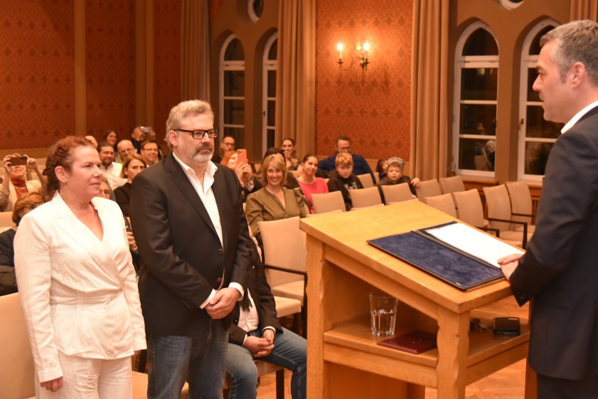 (ty) Nach bereits jahrzehntelanger Romanze haben sie sich am gestrigen Dienstagabend in der Kreisstadt offiziell das Ja-Wort gegeben: Kerstin Schnapp (48), stellvertretende Landrätin von Pfaffenhofen, und der hiesige Medien-Unternehmer Florian Schaipp (50). Die standesamtliche Trauung fand im Fest-Saal des Rathauses statt. Kein geringerer als Bürgermeister Thomas Herker (SPD) übernahm die Rolle des Standesbeamten. Er hielt dabei auch eine launige Rede, die nicht nur das Brautpaar, sondern die gesamte Hochzeits-Gesellschaft zum Schmunzeln brachte.