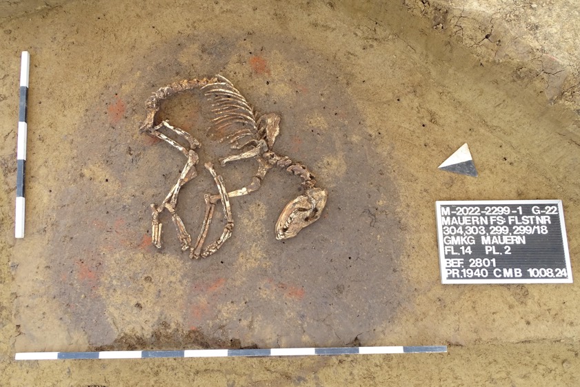 (ty) Einen besonderen Fund hat das Archäologen-Team in den vergangenen Grabungs-Wochen im "Wollersdorfer Feld" in Mauern (Kreis Freising) verzeichnet: "In einer großen Grube legten sie ein annähernd vollständiges Hunde-Skelett frei", teilte das Landratsamt heute mit. "Das Tier war dort intentionell vom Menschen niedergelegt worden." Im Vergleich zu den menschlichen Skeletten aus der Grabung sei der Erhaltungs-Zustand der Knochen besser gewesen, "bei der Bergung stellten sie sich dennoch als recht fragil heraus".