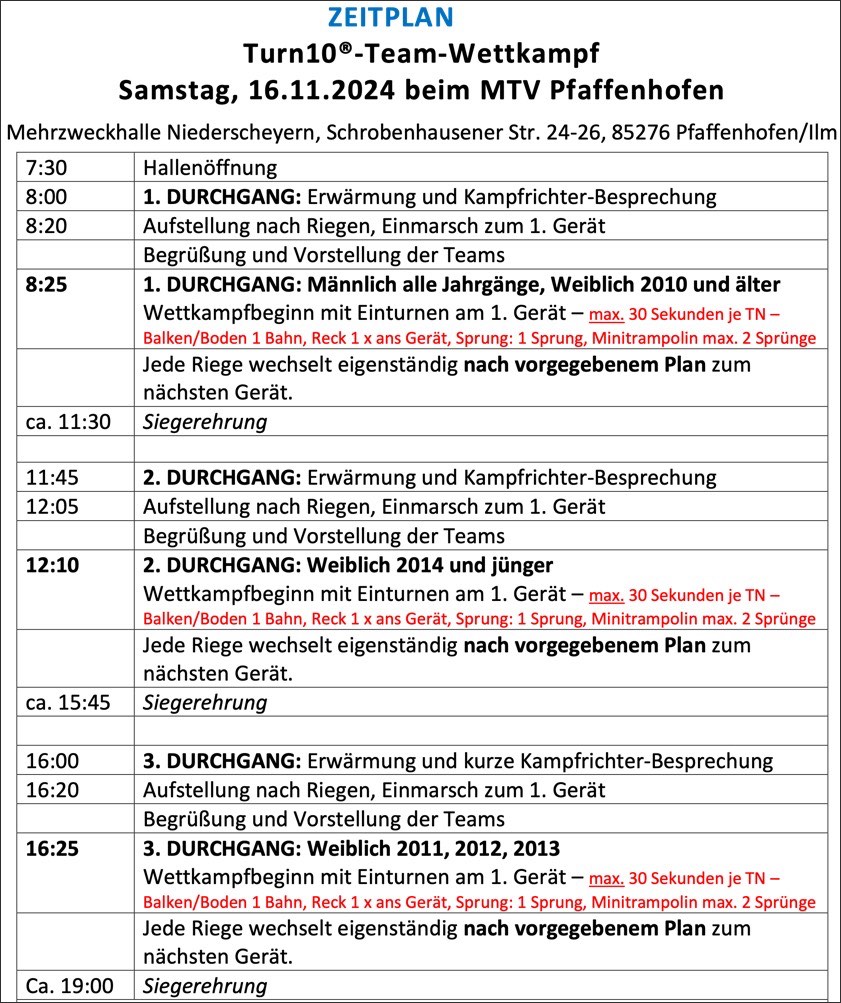 (ty) Ein großes Sport-Event steht am kommenden Samstag, 16. November, in Pfaffenhofen-Niederscheyern an. Der Turngau Donau-Ilm veranstaltet in der dortigen Mehrzweck-Halle seinen diesjährigen "Turn10"-Team-Wettkampf. Laut der Ankündigung der Organisatoren ist die Veranstaltung größer denn je. Mit 314 gemeldeten jungen Sportlerinnen und Sportlern aus 16 Vereinen werde man einen neuen Rekord aufstellen. 80 Teams werden demnach bei den um 8 Uhr beginnenden Wettkämpfen an den Start gehen. Die Sieger-Ehrungen erfolgen gegen 19 Uhr. Den genauen Zeitplan finden Sie am Ende dieses Beitrags.