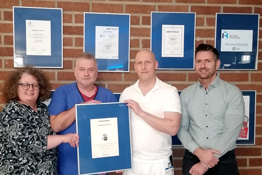(ty) Das Krankenhaus in Pfaffenhofen ist mit dem Gold-Zertifikat der Aktion "Saubere Hände" ausgezeichnet worden (Foto oben). Dieses würdige das herausragende Engagement in der Förderung der Hände-Hygiene sowie die konsequente Einhaltung höchster Hygiene-Standards, heißt es aus der Ilmtalklinik-GmbH. Die Aktion "Saubere Hände" sei 2008 ins Leben gerufen worden, basiere auf Empfehlungen der Welt-Gesundheits-Organisation (WHO) und habe es sich zur Aufgabe gemacht, die Bedeutung der Hände-Hygiene in Krankenhäusern sowie Pflege-Einrichtungen stärker in den Fokus zu rücken.