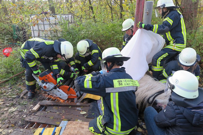 (ty) Zu einem nicht alltäglichen Einsatz ist die Feuerwehr gestern in Freising gerufen worden. Die Floriansjünger berichten von einer zeit- und material-intensiven Großtier-Rettung. Am Schafhof galt es ein Isländer-Pony aus einer äußerst misslichen Lage zu befreien. "Das Pferd war mit den Hinterläufen in einen Weide-Rost geraten und klemmte fest", erklärt ein Feuerwehr-Sprecher. Noch vor dem Eintreffen der alarmierten Helfer habe sich das Tier zur Seite gedreht und so unglücklich verkeilt, dass eine einfache Befreiung nicht mehr möglich gewesen sei.