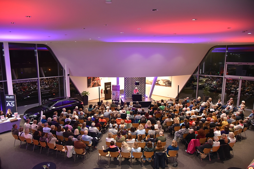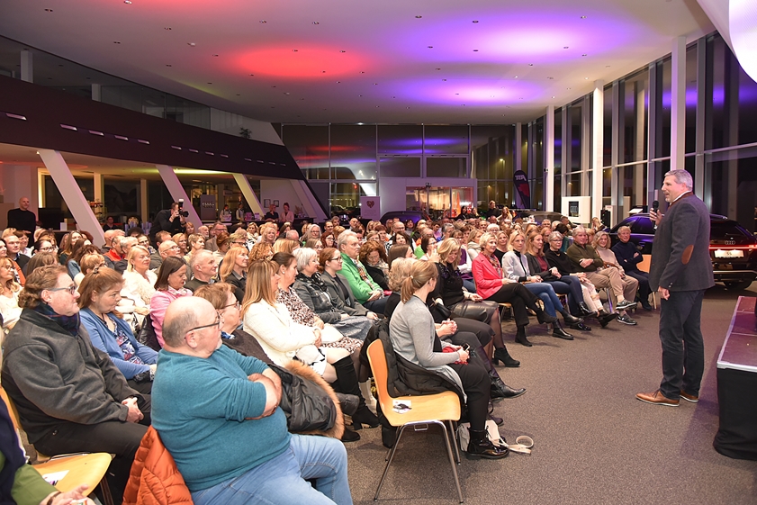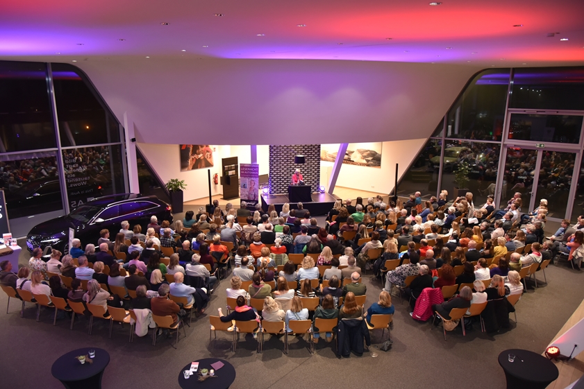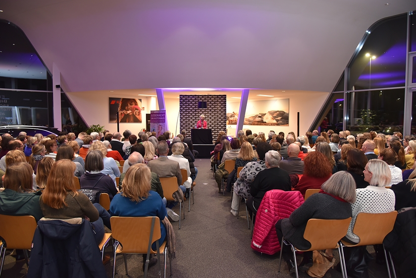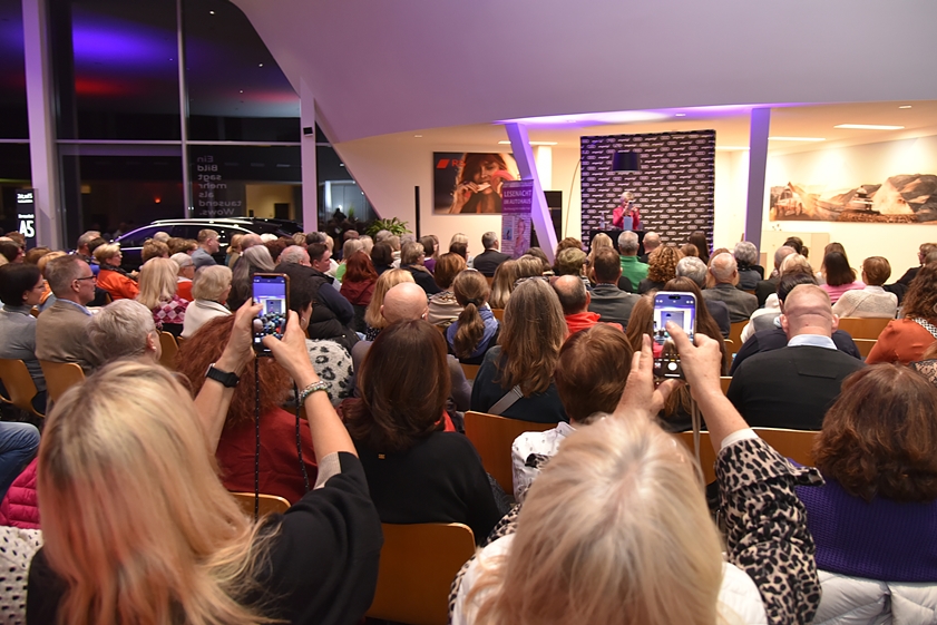 Schon beim Betreten des Autohauses war den Besuchern klar: Hier herrscht eine ungewöhnliche, aber stimmungsvolle Atmosphäre zwischen leistungsstarken Autos und moderner Architektur, die der literarischen Note einen durchaus passenden Rahmen bietet.