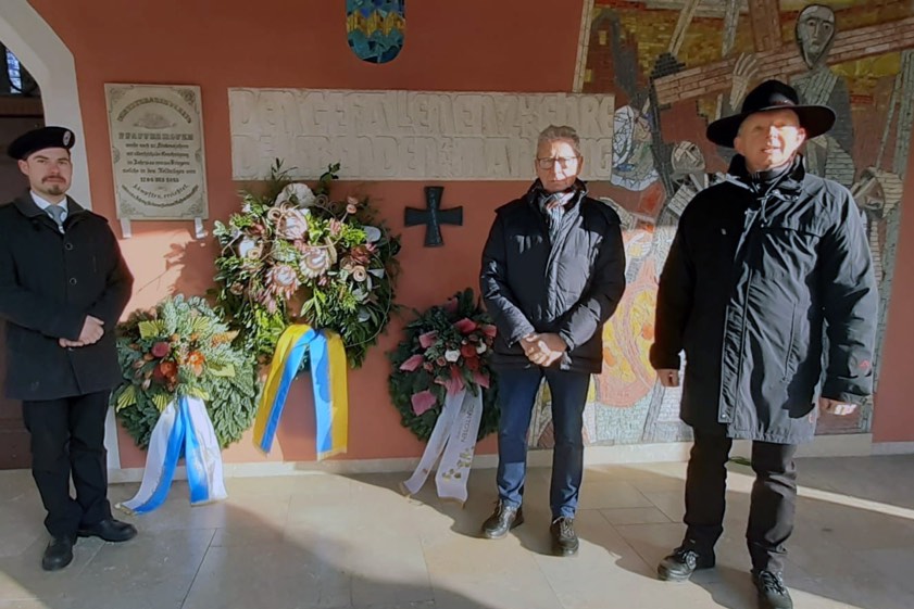 (ty) Zum ehrenden Gedenken an die Opfer beider Weltkriege und jeglicher Gewaltherrschaft ist in Deutschland am vergangenen Sonntag der Volkstrauertag begangen worden. Aus diesem Anlass fand in Pfaffenhofen in der Stadtpfarrkirche zunächst ein Gedenk-Gottesdienst statt. Nach dieser Messe erfolgte dann eine Toten-Ehrung an der Gedächtnisstätte vor der Spitalkirche am oberen Hauptplatz. Mit dabei waren bei der Kranz-Niederlegung am Kriegerdenkmal auch Vize-Bürgermeister Roland Dörfler (Grüne), Dominik Schmidt als Vorsitzender des örtlichen Soldaten- und Krieger-Vereins und Herbert Heinrich als VdK-Ortsvorsitzender (Foto oben).