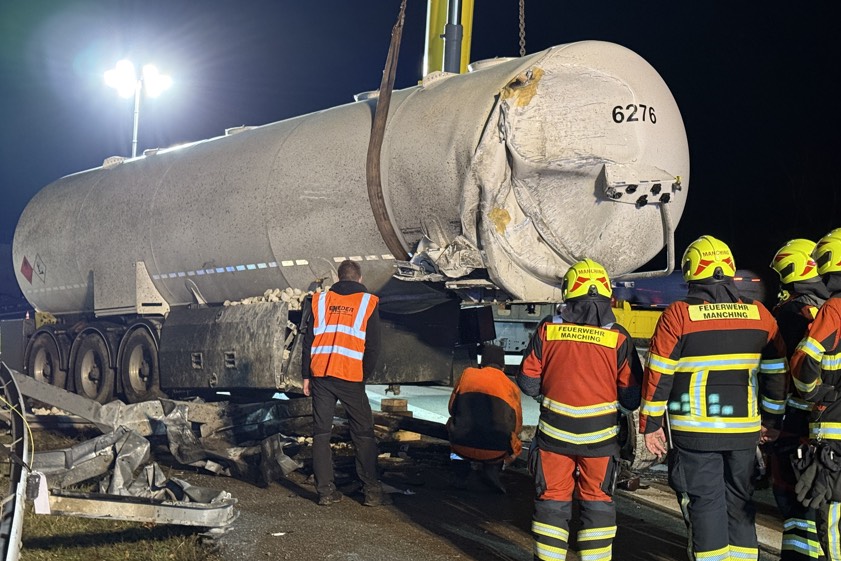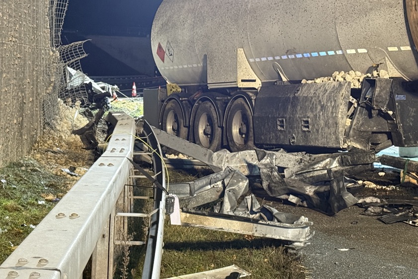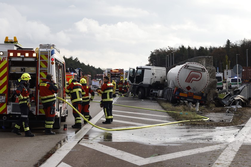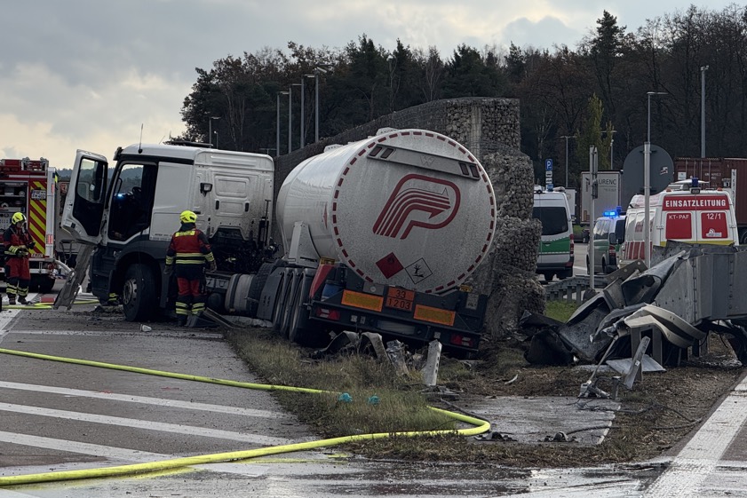Mit Benzin beladener Sattelzug prallte gestern frontal in Lärmschutz-Wand, Fahrer (63) wurde schwer verletzt. A9 über Stunden gesperrt.