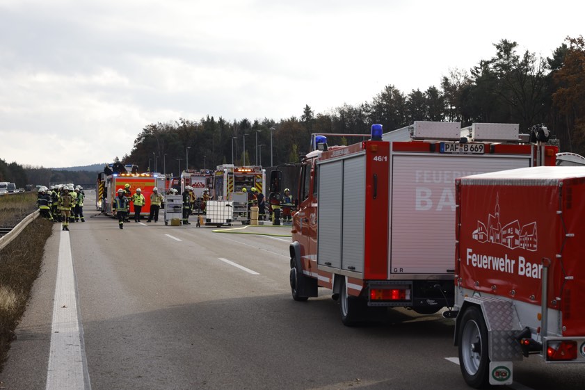 An der Unfallstelle waren die Berufsfeuerwehr aus Ingolstadt sowie die Freiwilligen Feuerwehren aus Manching, Oberstimm, Baar, Ebenhausen, Schweitenkirchen und Reichertshofen. Das Technische Hilfswerk (THW) war zur Ausleuchtung der Unglücksstelle in den Abendstunden ebenfalls vor Ort. Wegen des auslaufenden Benzins waren das Landratsamt von Pfaffenhofen, das Wasserwirtschaftsamt in Ingolstadt sowie ein Sachverständiger eingebunden. Angesichts der Autobahn-Sperrung wurde der Verkehr an der Anschlussstelle bei Manching abgeleitet. Es kam zu erheblichen Verkehrs-Beeinträchtigungen.
