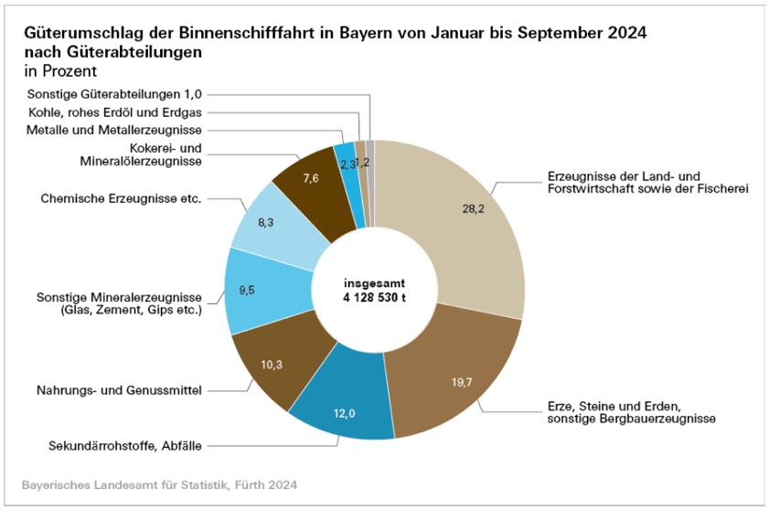 In den Häfen der bayerischen Bundeswasserstraßen wurden heuer von Januar bis einschließlich September hauptsächlich "Erzeugnisse der Land- und Forstwirtschaft" (28,2 Prozent) sowie "Erze, Steine und Erden" (19,7 Prozent) umgeschlagen. Weitere 12,0 Prozent entfielen auf die Abteilung "Sekundär-Rohstoffe, Abfälle".