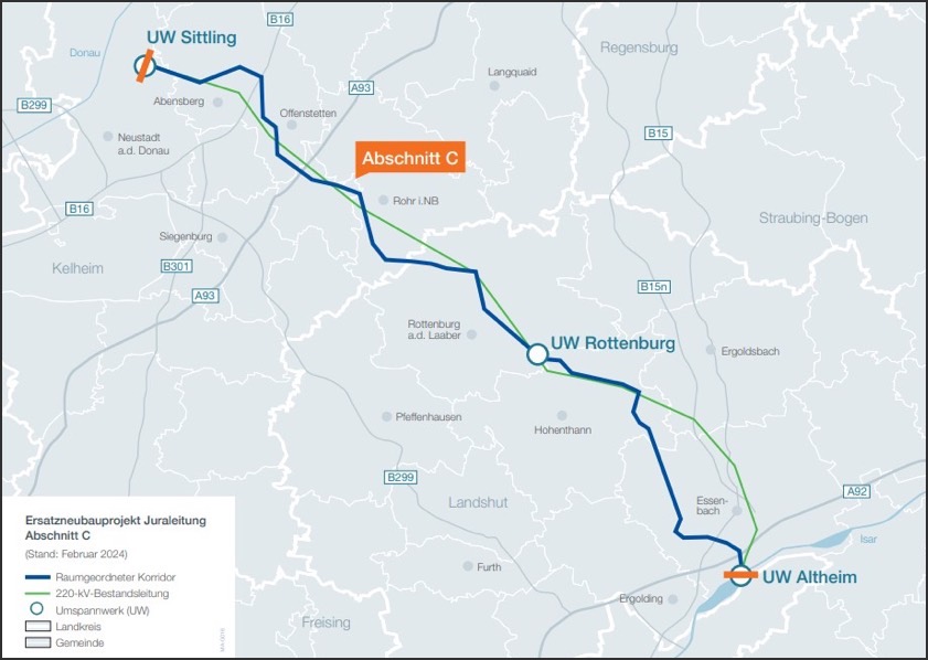 (ty) Die Regierung von Niederbayern hat nach eigenem Bekunden das Anhörungs-Verfahren im Rahmen der Planfeststellung für den Neubau der 380-kV-Leitung "Sittling – Altheim" ("Juraleitung", Abschnitt C) eingeleitet. Das Verfahren war von der Tennet-TSO-GmbH als Übertragungsnetz-Betreiberin beantragt worden.