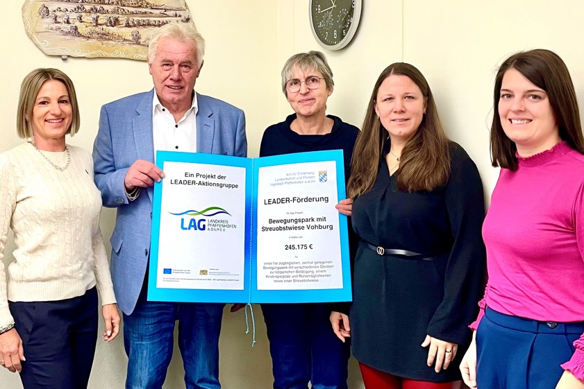 (ty) Das Projekt "Bewegungspark mit Streuobstwiese" in Vohburg wird mit 245 175 Euro aus dem EU-Förder-Programm "Leader" unterstützt. Der entsprechende Zuwendungs-Bescheid wurde kürzlich von Agnes Stiglmaier, "Leader"-Koordinatorin am Amt für Ernährung, Landwirtschaft und Forsten Ingolstadt-Pfaffenhofen, sowie Tina Schuler von der "Lokalen Aktions-Gruppe" (LAG) übergeben. In Empfang genommen wurde er von Bürgermeister Martin Schmid (SPD) sowie Sophia Leopold, Leiterin der Finanz-Verwaltung im Rathaus, und Karin Kis, Leiterin des Gemeinde-Bauamts (Foto oben).