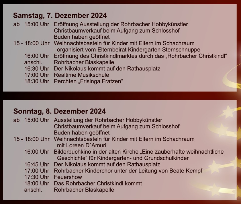 (ty) Ganz im Zeichen des diesjährigen Christkindlmarktes steht das kommende, zweite Advents-Wochenende in der Gemeinde Rohrbach. Die weihnachtlich geschmückten Buden auf dem örtlichen Rathausplatz werden am Samstag, 7. Dezember, und am Sonntag, 8. Dezember, jeweils ab 15 Uhr geöffnet sein, heißt es in der Ankündigung des vom Schneesport-Verein und der Gemeinde gemeinsam veranstalteten Spektakels. Unten aufgeführt ist das gesamte Programm, das unter anderem eine Kunst-Ausstellung, einen Perchten-Auftritt, zwei Nikolaus-Besuche und eine Feuer-Show umfasst.