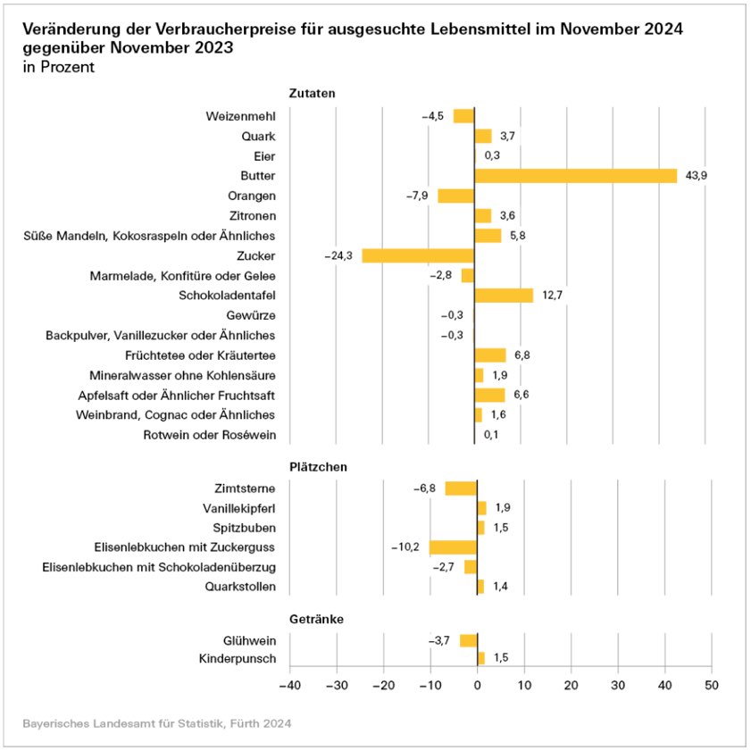 Außerdem heißt es: Die Rezepte seien von den Experten des bayerischen Landesamts für Statistik anhand deren eigenen Vorlieben ausgewählt worden. Bei der Berechnung der jeweiligen Preissteigerungen des Plätzchen-Backens seien dann nur die Preissteigerungen der Zutaten berücksichtigt worden.