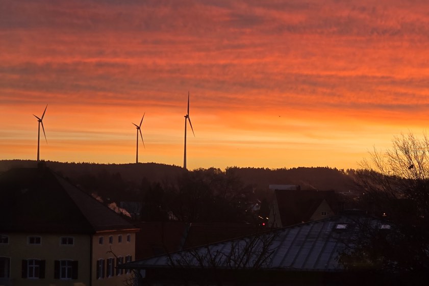 (ty) Und weiter geht sie, die Serie von beeindruckenden Fotos aus der Region, die uns unsere Leserinnen und Leser nach wie vor übermitteln. Die beiden Motive (siehe auch unten), die wir Ihnen am heutigen Dienstag zeigen können, hat uns Christian Singer aus der Kreisstadt gestern zukommen lassen. Entstanden sind beide von seiner Wohnung im Stadtgebiet aus, berichtet er. Eine Aufnahme zeigt den Blick auf die drei nahe gelegenen Windkraft-Anlagen bei Sonnenaufgang, das andere Bild unter anderem den Turm der Stadtpfarrkirche.