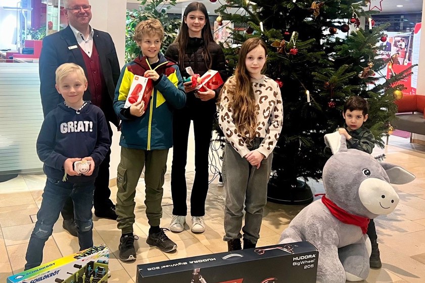 Stellvertretend für alle Gewinnerinnen und Gewinner zeigt das Bild oben die Mädchen und Buben, die ihre Belohnungen in der Hauptstelle in Pfaffenhofen in Empfang nahmen. Marktbereichs-Leiter Florian Anthofer begrüßte Kinder wie Eltern und blickte noch einmal auf die Spartage zurück. Dann wurden die Sprösslinge nicht mehr länger auf die Folter gespannt und erhielten ihre Preise. Für die kleinen Gewinner gab es Roller, Laufräder, Riesen-Plüschtiere, Sitz-Säcke, Experimentier-Kästen, Bluetooth-Lautsprecher, Hüpf-Pferde und Tisch-Kicker.