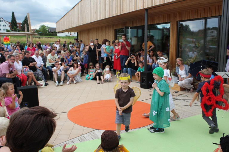 (ty) Die städtische Kindertagesstätte Ecolino in Weihern ist jetzt auch offiziell eröffnet. Am Wochenende wurde das dort gefeiert. Die ersten Kinder sind ja bereits vor einem halben Jahr in den Vorzeige-Neubau im Ecoquartier eingezogen und fühlen sich bereits recht wohl. Mittlerweile sind auch die Außenanlagen fertiggestellt, so dass jetzt mit einem bunten Sommerfest die Inbetriebnahme ganz offiziell gefeiert werden konnte. Da waren natürlich Kinder, Eltern und Erzieherinnen, Planer und Architekten, Bürgermeister, Stadträte und Verwaltung mit dabei.