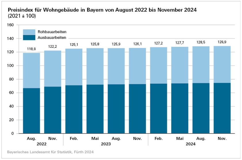 (ty) Nach Angaben des bayerischen Landesamts für Statistik ist der Preisindex für den Neubau von Wohngebäuden im Freistaat im November dieses Jahres im Vergleich zum Vorjahres-Monat um 2,2 Prozent gestiegen. Damit liegen die Baupreise um 0,3 Prozent über dem letzten Erhebungs-Monat im August dieses Jahres. Im August hatte die Preissteigerungsrate binnen Jahresfrist noch 2,1 Prozent betragen. Nach der sehr dynamischen Preisentwicklung, die seit Mitte 2021 mit Sprüngen von über 17 Prozent zu beobachten war, stabilisierten sich die Preise bis zur Jahresmitte auf vergleichsweise hohem Niveau. "Nun scheint die Preisentwicklung nach oben zum Jahresende wieder an Fahrt zu gewinnen", so die Behörde.
