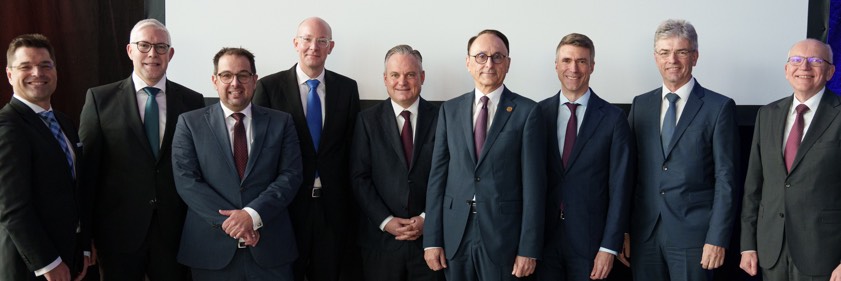 Von links: Andreas Streb (Stellvertretender Vorstands-Vorsitzender und künftiger Vorstands-Chef), Helmut Kundinger (Vorstands-Mitglied), Nico Hirsch (Betriebsrats-Vorsitzender), Cornelius Riese (Vorstands-Vorsitzender der DZ-Bank-AG), Christian Scharpf (Oberbürgermeister der Stadt Ingolstadt), Richard L. Riedmaier (scheidender Vorstands-Vorsitzender), Stefan Müller (Vorstand des Genossenschafts-Berbands Bayern), Wolfgang Gebhard (Vorstands-Mitglied) und Franz Mirbeth (Vorstands-Mitglied).