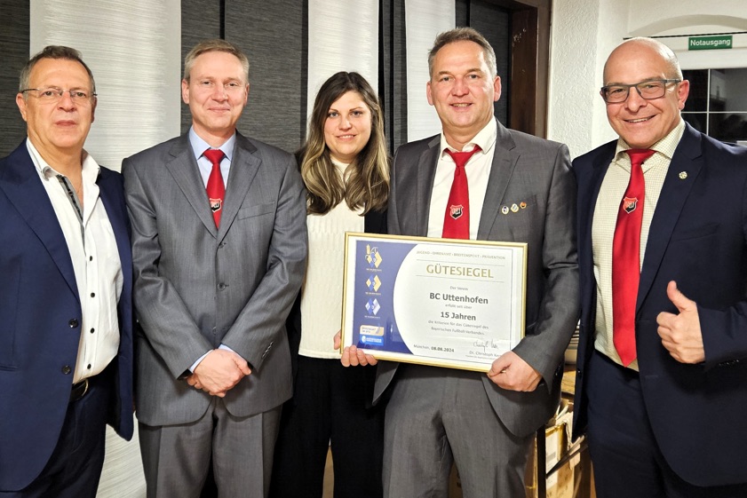 (ty) Als erster Verein im Fußball-Kreis Donau-Isar hat der Ball-Club Uttenhofen (BCU) das Gütesiegel des bayerischen Fußball-Verbands (BFV) für langjährige herausragende Leistung erhalten. Überreicht wurde diese Auszeichnung kürzlich im Rahmen der BCU-Weihnachtsfeier von Norbert Thurner, dem hiesigen BFV-Ehrenamts-Beauftragten (Foto oben). Der BCU ist damit laut eigenem Bekunden nach der DJK Emmering erst der zweite Verein in ganz Oberbayern, der sich über diese außergewöhnliche Würdigung freuen kann.