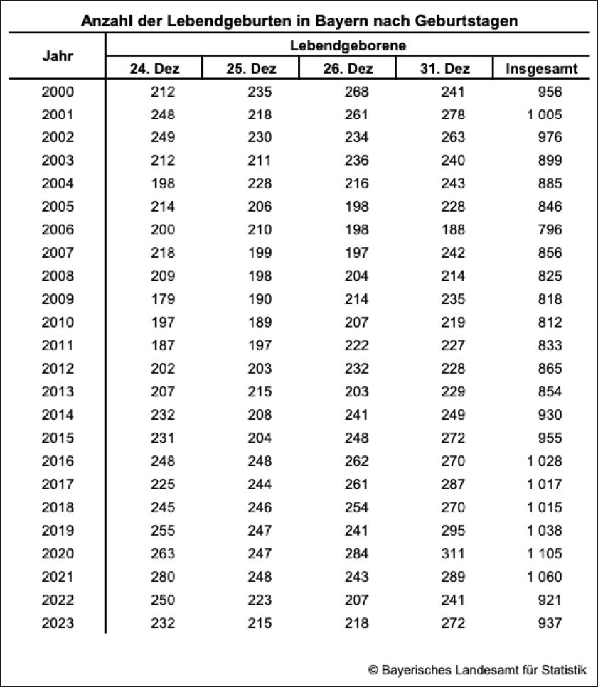 Unter den im vergangenen Jahr in Bayern insgesamt 116 505 lebend geborenen Kindern gab es also 232 "Christkinder" – 112 Buben und 120 Mädchen. Damit belegte der 24. Dezember bei der täglichen Anzahl an Geburten im gesamten vergangenen Jahr Platz 361 von 365. Die Neugeborenen-Zahlen an Heiligabend, an den beiden Weihnachts-Feiertagen und am letzten Tag des Jahres liegen in der Regel auf niedrigem Niveau relativ nah beieinander. Am 25. Dezember vergangenen Jahres waren 215, am 26. Dezember 218 und am 31. Dezember 272 Kinder geboren worden.