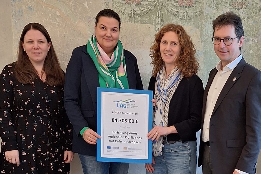 Für den Betrieb sei von engagierten Einheimischen schon eigens die Dorfladen-Pörnbach-UG gegründet worden, lobt die LAG. An die beiden Geschäftsführerinnen der UG, Janina Schweiger und Gertraud Haslauer, sowie an Bürgermeister Helmut Bergwinkel übergab LAG-Managerin Tina Schuler den Förder-Bescheid über exakt 84 705 Euro. "Hier entsteht wirklich ein schönes klassisches Leader-Projekt – ein Projekt von Bürgern für Bürger", betonte Schuler.