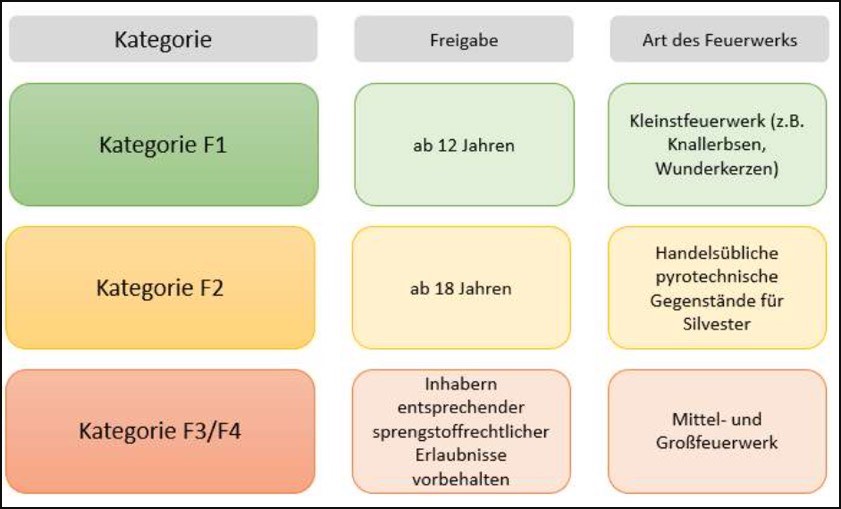 "Pyrotechnik der Kategorie 3 und 4 ist oftmals auf Märkten im benachbarten Ausland oder im Internet zu günstigen Konditionen frei erhältlich, in Deutschland jedoch nicht erlaubt", unterstreicht das bayerische Landeskriminalamt und stellt auch klar: "Selbst eine vorhandene CE-Zertifizierung für ein Kategorie-3-Feuerwerk auf ausländischen pyrotechnischen Gegenständen schützt nicht vor Strafe." Denn: "Feuerwerk der Kategorie 3 ist zwar in vielen europäischen Ländern für Personen über 21 Jahren frei verkäuflich, nicht jedoch in Deutschland." Eine Übersicht dazu bietet die nachfolgende Grafik.