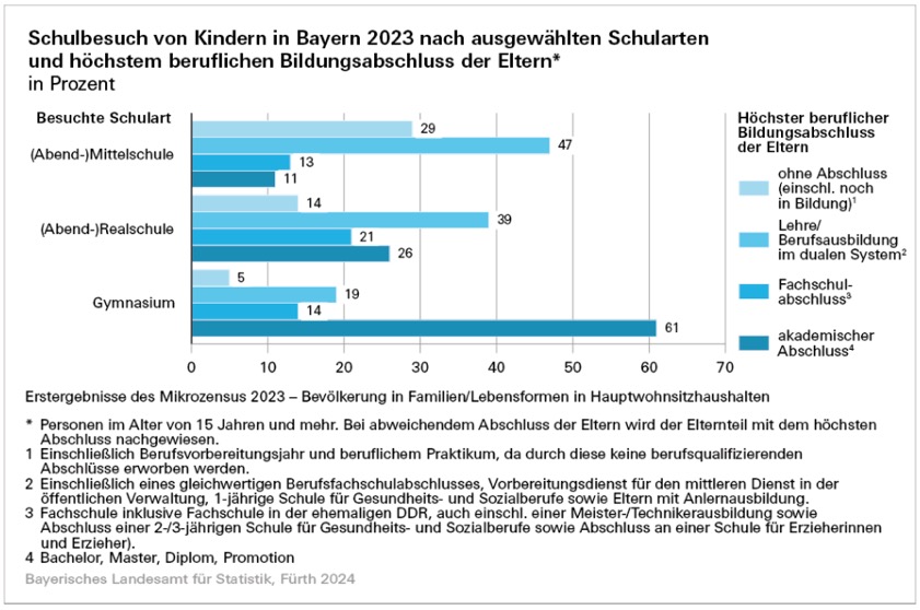 Ein Blick in Familien zeigte dabei: Bei 47 Prozent der Mittelschülerinnen und -schüler in Bayern verfügten die Eltern als höchsten beruflichen Bildungs-Abschluss über eine Lehre oder Berufs-Ausbildung. Rund 13 Prozent der Mittelschulkinder hatten mindestens ein Elternteil mit einem Fachschul-Abschluss und elf Prozent hatten ein Elternteil mit akademischem Abschluss. Bei 29 Prozent der Schulkinder hatten die Eltern keinen beruflichen Bildungs-Abschluss.