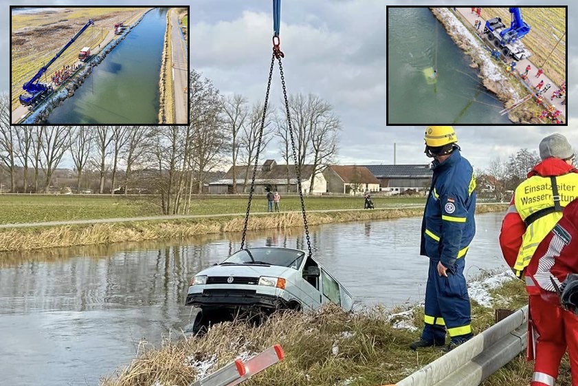 (ty) Ein spektakulärer Unfall hat sich am späten gestrigen Vormittag im Gemeinde-Gebiet von Zolling (Landkreis Freising) ereignet. Ein mit zwei Personen besetzter Kleinbus rutschte wegen eines missglückten Fahr-Manövers zunächst in den Amper-Kanal und versank letztlich vollständig im eiskalten Wasser. Der 44 Jahre alte Lenker des Wagens und dessen 16-jährige Tochter, die sich auf dem Beifahrersitz befunden hatte, konnten sich befreien und retten – beide kamen offenbar mit dem Schrecken davon. Zahlreiche Einsatzkräfte mussten für die aufwändigen Bergungs-Maßnahmen anrücken.