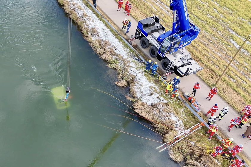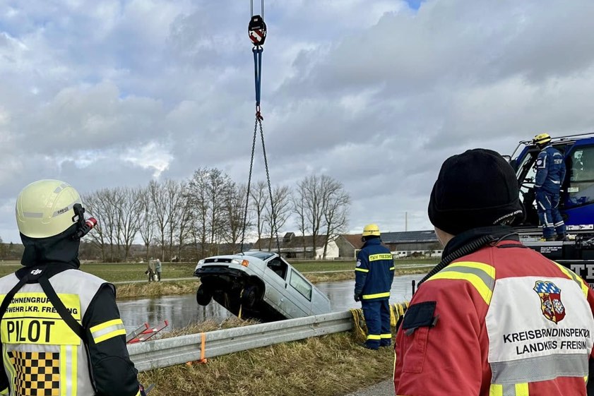 Wie die Freisinger Kreisbrandinspektion erklärt, trieb der Kleinbus weiter ab und ging schließlich komplett unter. "Die Mitteiler konnten den Feuerwehren zwar den ungefähren Standort des Fahrzeuges mitteilen, aufgrund des abfallenden Ufers zur Wasseroberfläche war eine Sicht auf den versunkenen Bus jedoch nicht möglich." Um den Wagen genau lokalisieren zu können, sei ein senkrechter Blick von oben notwendig gewesen – aus diesem Grund sei die Drohnen-Gruppe des Landkreises angefordert worden. Nachdem der VW-Bus per Drohnen-Überflug ausfindig gemacht war, wurde die weitere Bergung vorbereitet. Dafür war auch ein Kran des Technischen Hilfswerks (THW) im Einsatz.