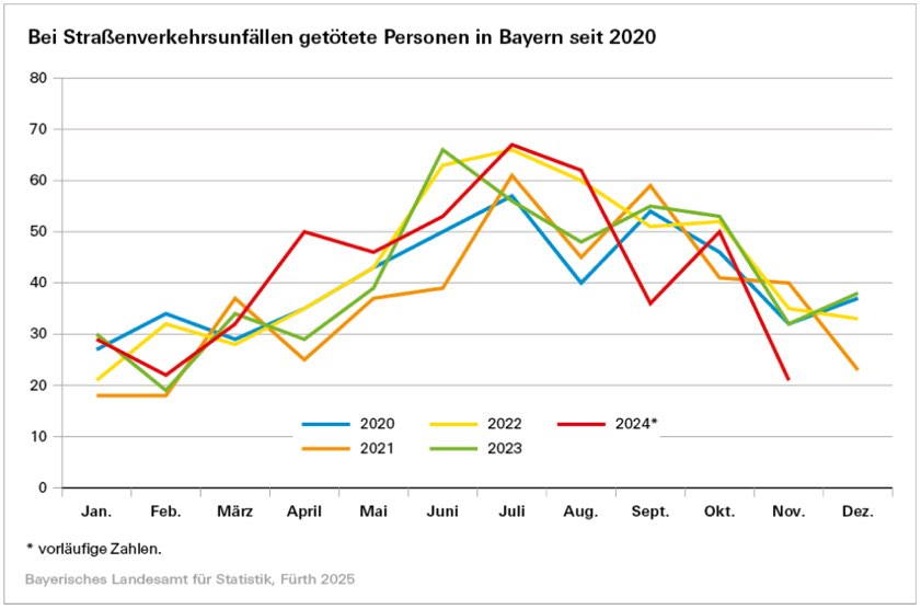 Von Januar bis einschließlich November vergangenen Jahres sank die Gesamtzahl der in Bayern registrierten Verkehrsunfälle leicht um 1,8 Prozent auf 348 678. Mit dabei insgesamt gezählten 57 665 Verunglückten wurden im genannten Zeitraum laut Landesamt für Statistik um 2,3 Prozent weniger Menschen im bayerischen Straßenverkehr getötet oder verletzt als im entsprechenden Vorjahres-Zeitraum.