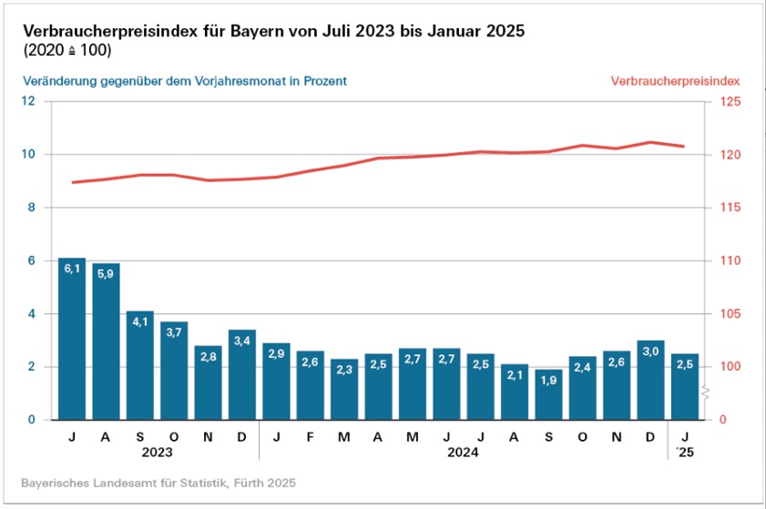 (ty) Im Freistaat sind die Verbraucherpreise im zu Ende gehenden Januar gegenüber dem Vorjahres-Monat um 2,5 Prozent gestiegen. Das wurde am heutigen Freitag aus dem bayerischen Landesamt für Statistik bekannt gegeben. Den Angaben zufolge kosten Nahrungsmittel aktuell um 1,7 Prozent mehr als im Vorjahr; Energie kann hingegen um 1,6 Prozent günstiger bezogen werden. Im Vergleich zum Dezember fielen die Verbraucherpreise leicht. Nahrungsmittel wurden im Vergleich zum Vormonat günstiger (minus 0,7 Prozent). Die Preise für Heizöl (plus 9,2 Prozent) und Kraftstoffe (plus 5,0 Prozent) liegen indes deutlich über dem jeweiligen Vormonats-Wert. Strom (minus 1,9 Prozent) ist günstiger als im Dezember.