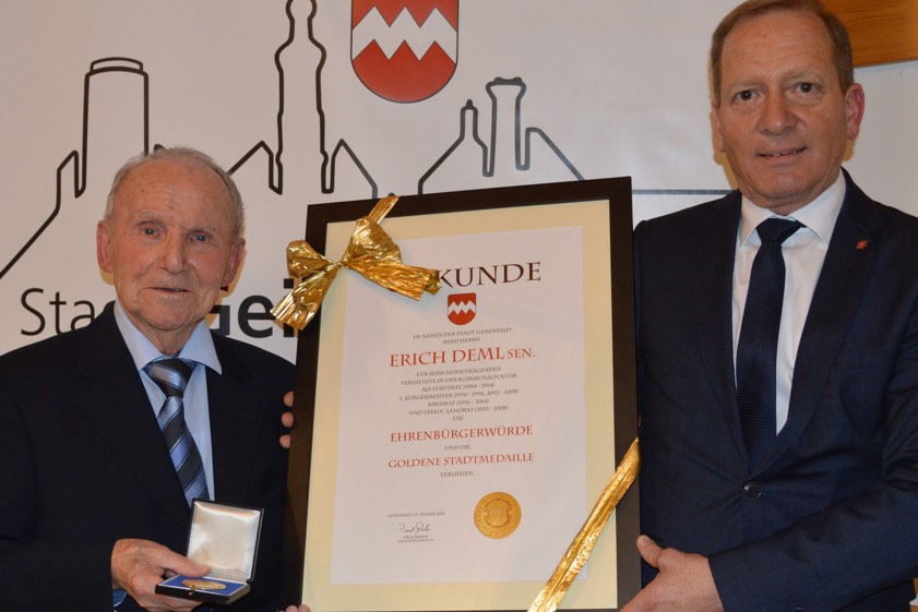 (ty) Große Anerkennung hat Erich Deml senior in Geisenfeld erfahren. Der 88-Jährige wurde nicht nur zum Ehrenbürger ernannt, sondern erhielt auch die Goldene Stadtmedaille – das sind die beiden höchsten Auszeichnungen, die die Stadt zu vergeben hat (Foto oben). Man würdige eine Persönlichkeit, die mit unternehmerischem Geschick, politischem Engagement und tiefer Verbundenheit zur Heimat Maßstäbe gesetzt habe, heißt es aus dem Rathaus.