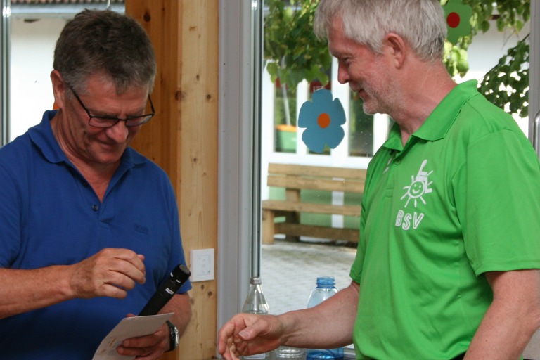 BLSV-Kreischef Florian Weiß (links( übergibt gleich dem BSV-Vorsitzenden Friedrich Voicht einen Gutschein zum Vereinsjubiläum.
