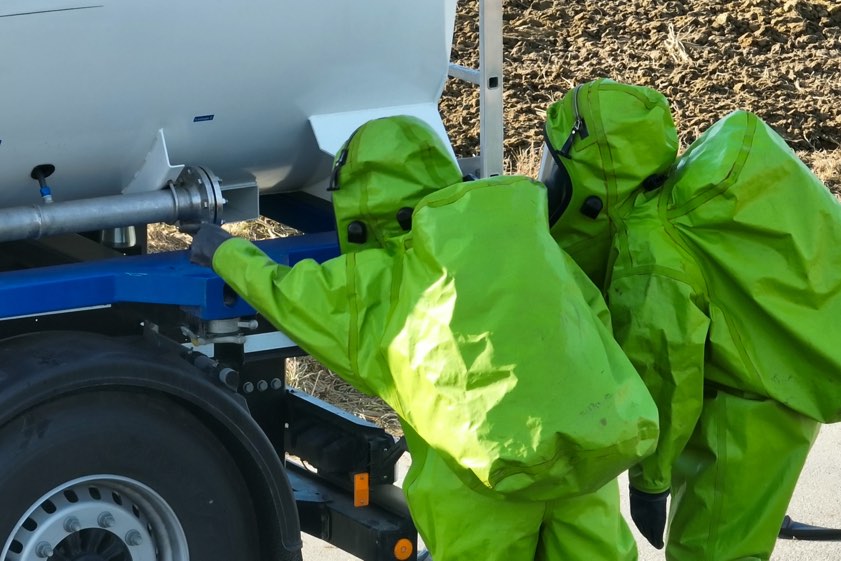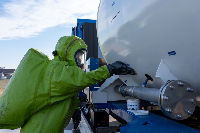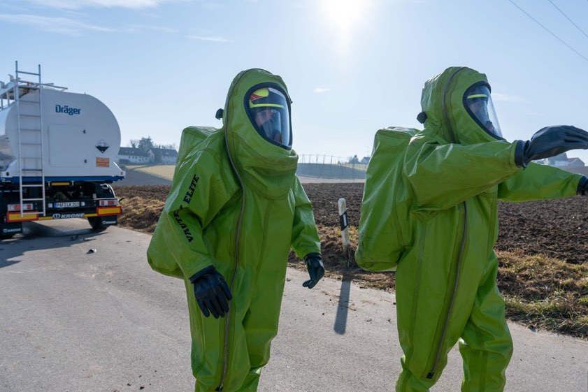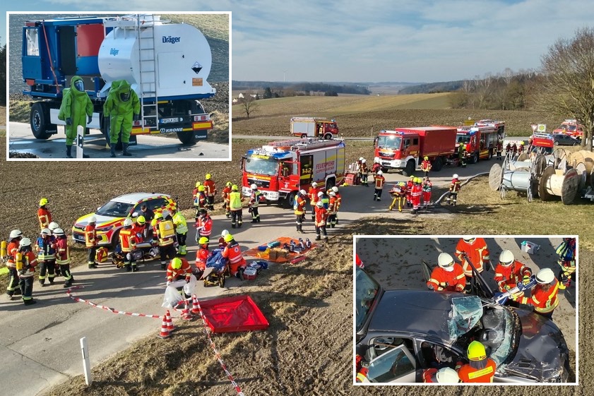 90 Einsatzkräfte von Rettungsdienst und Feuerwehren trainierten gemeinsam: Unfall mit Gefahrgut-Lkw, auslaufende Säure und Schwerverletzte.