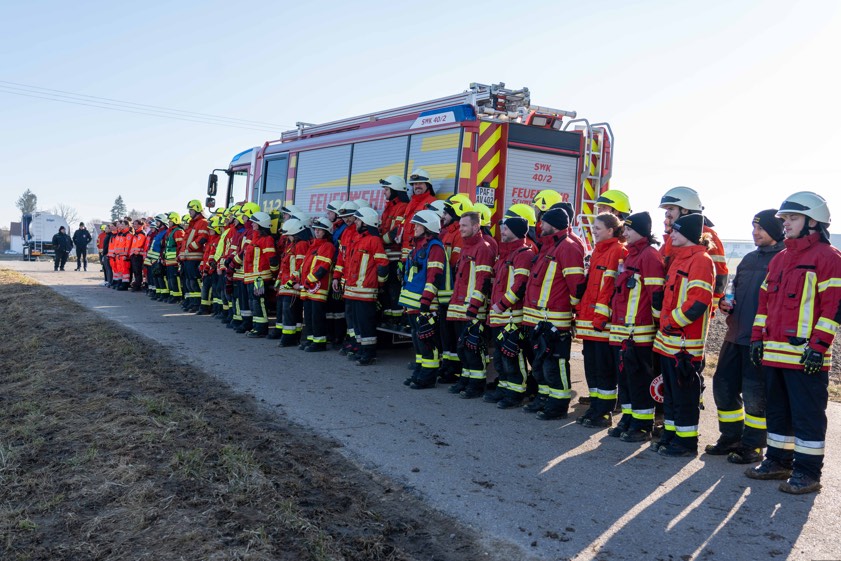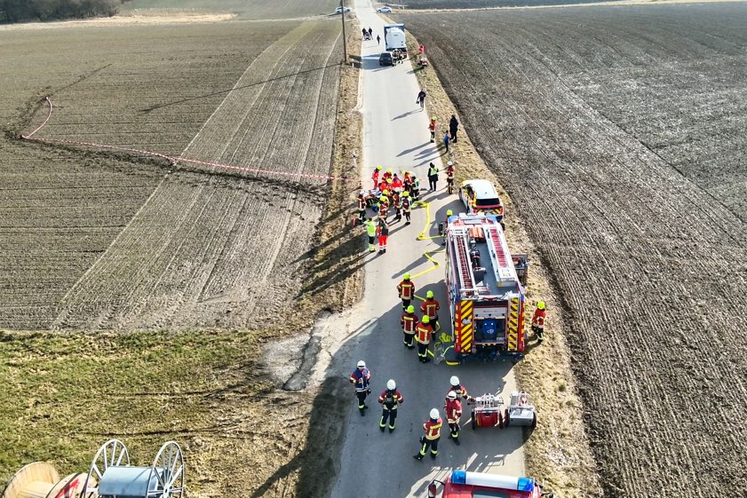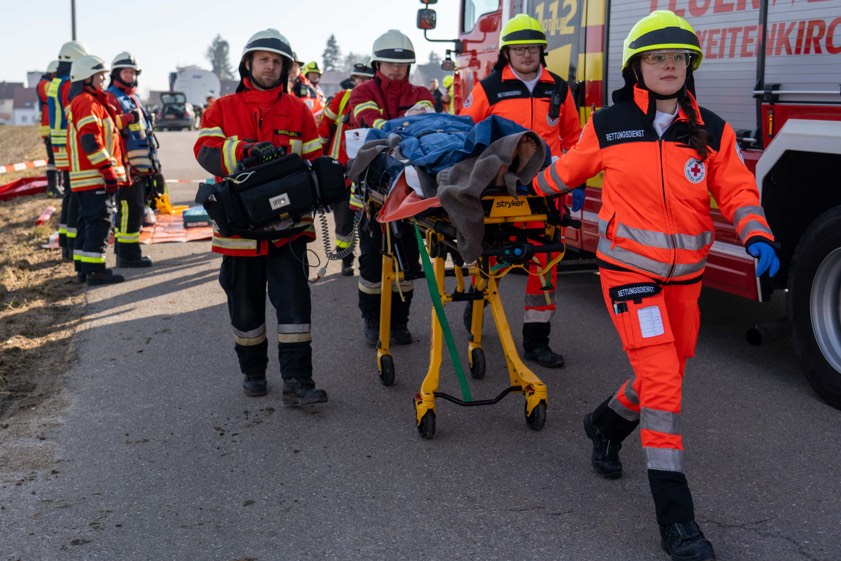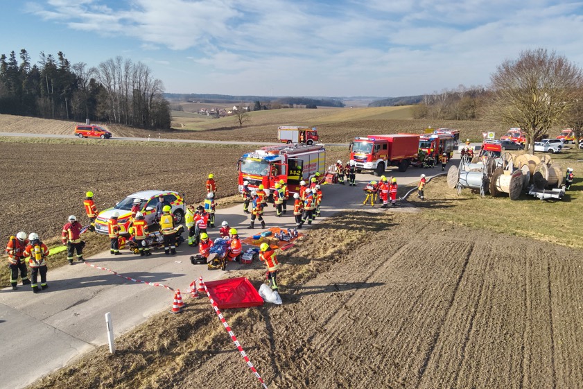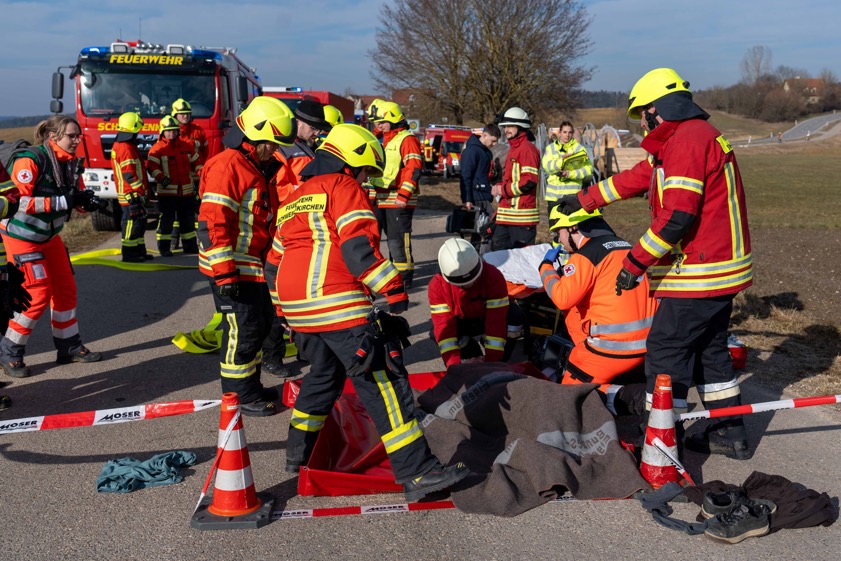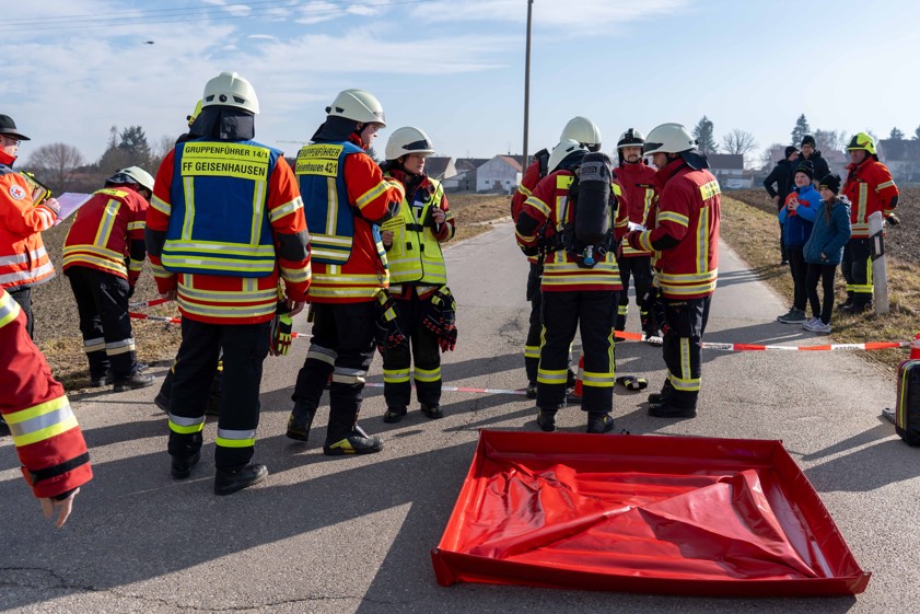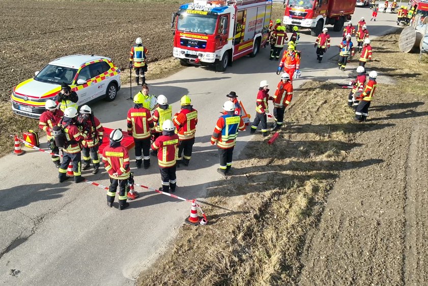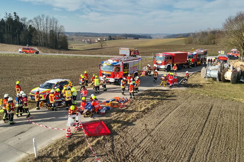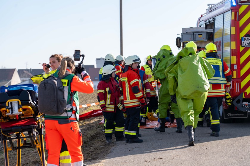 (ty) Ein heftiger Unfall mit einem Gefahrgut-Lastwagen, auslaufende Ameisensäure und schwer verletzte Personen – dieses Szenario hatten zahlreiche Einsatzkräfte am gestrigen Samstag im Rahmen einer groß angelegten Übung in Schweitenkirchen zu bewältigen. Gefordert waren dabei neben dem Rettungsdienst des BRK-Kreisverbands von Pfaffenhofen auch die Freiwilligen Feuerwehren aus Schweitenkirchen, Sünzhausen, Dürnzhausen, Aufham-Güntersdorf und Geisenhausen. Insgesamt waren rund 90 Helferinnen und Helfer beteiligt. Nachfolgend die Details und zahlreiche Fotos.
