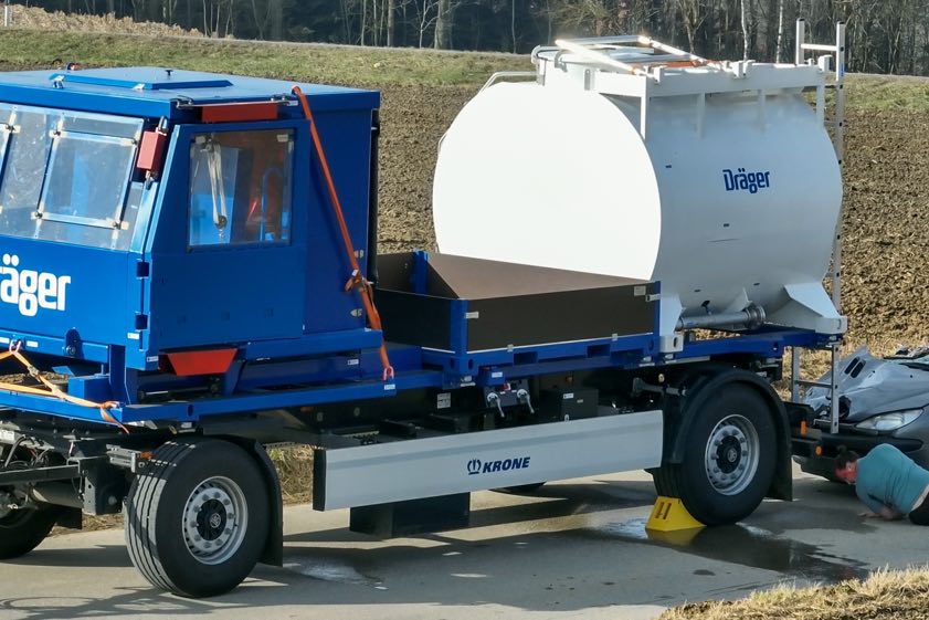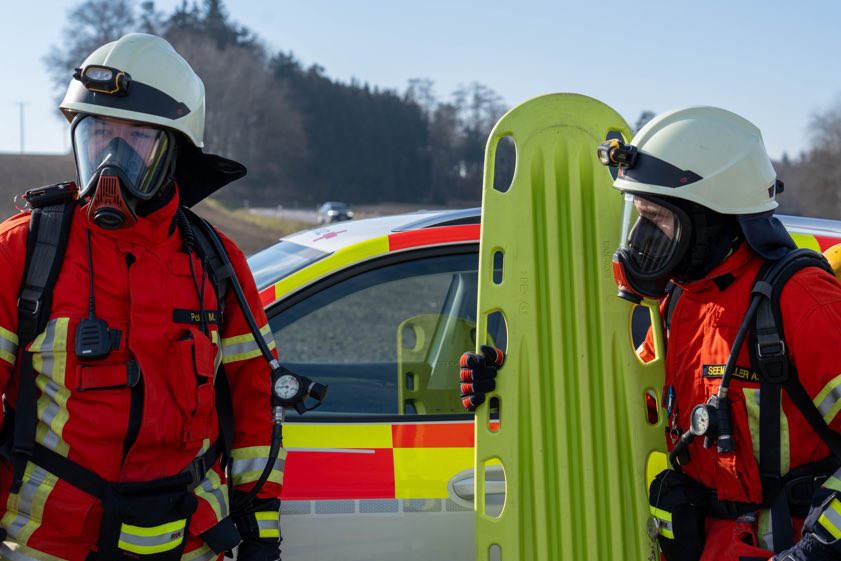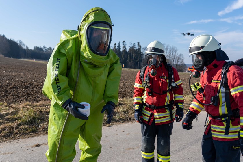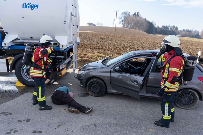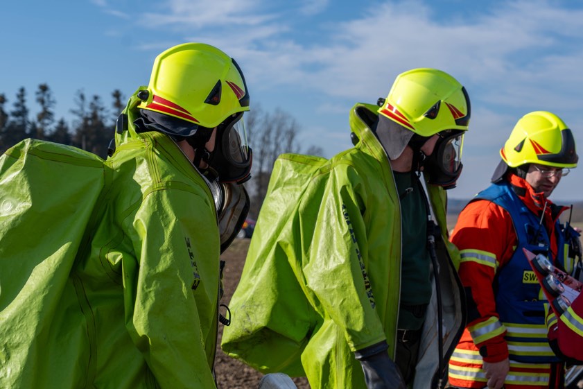 Die Feuerwehren sicherten die Unfallstelle, erkundeten unter schwerem Atemschutz die Lage und begannen mit der Rettung der Verletzten. Mit einer Seilwinde wurde der Pkw aus dem Gefahren-Bereich gezogen, während speziell ausgerüstete Trupps in chemischen Schutz-Anzügen den undichten Lastwagen sicherten. Gleichzeitig wurde der Rettungsdienst mit einer herausfordernden medizinischen Versorgung konfrontiert.