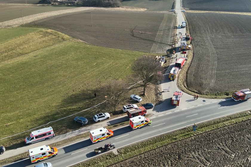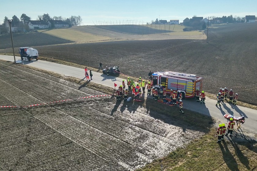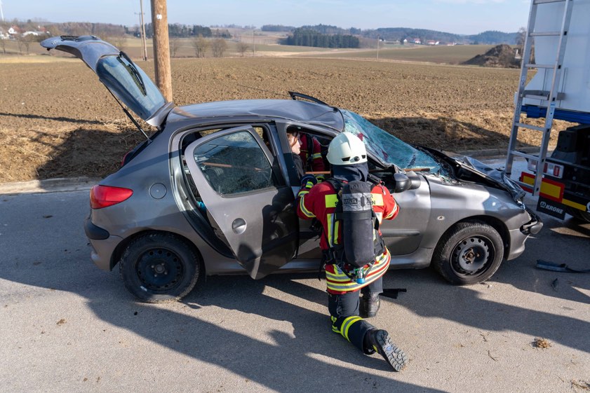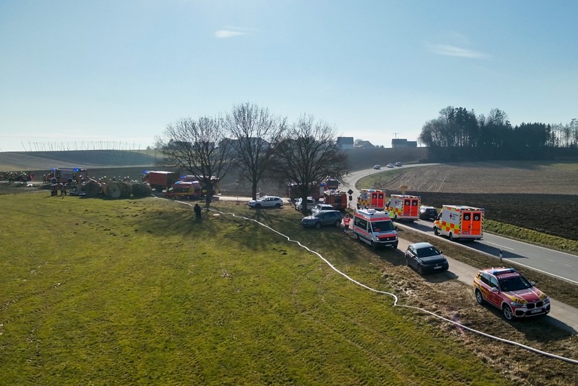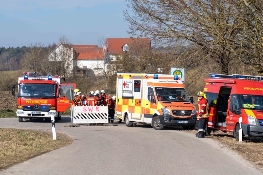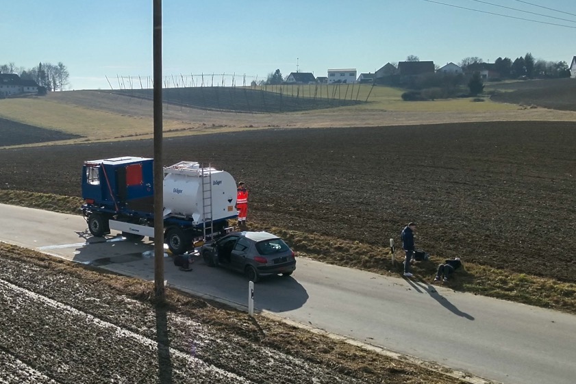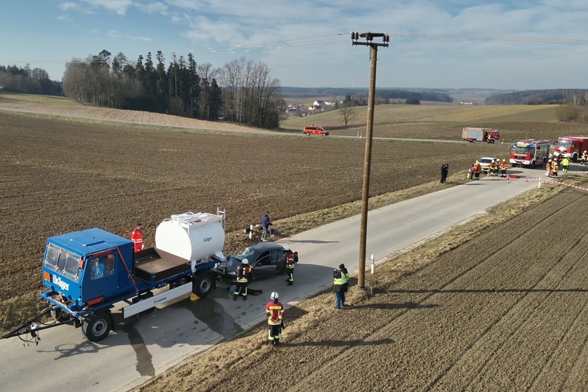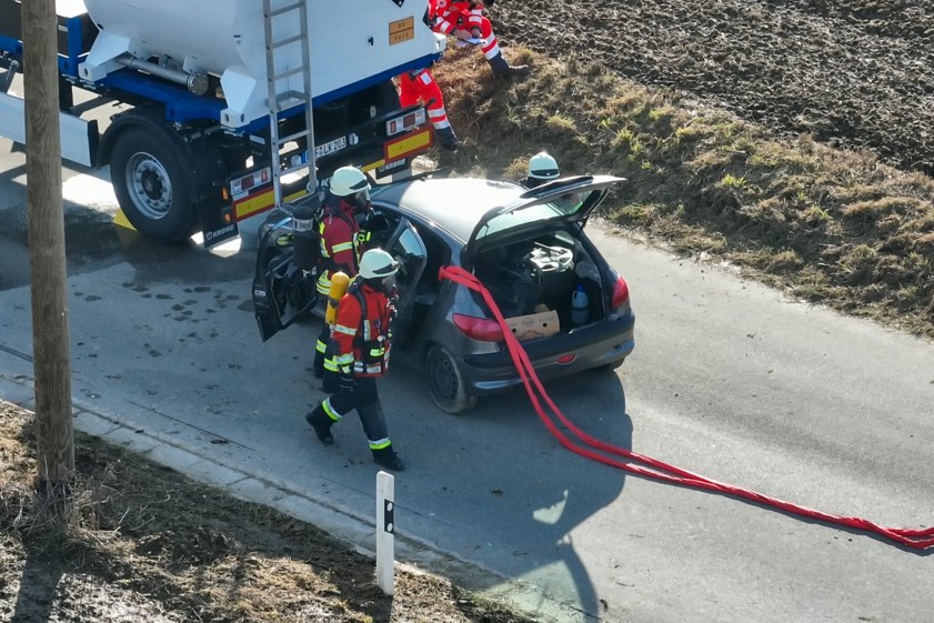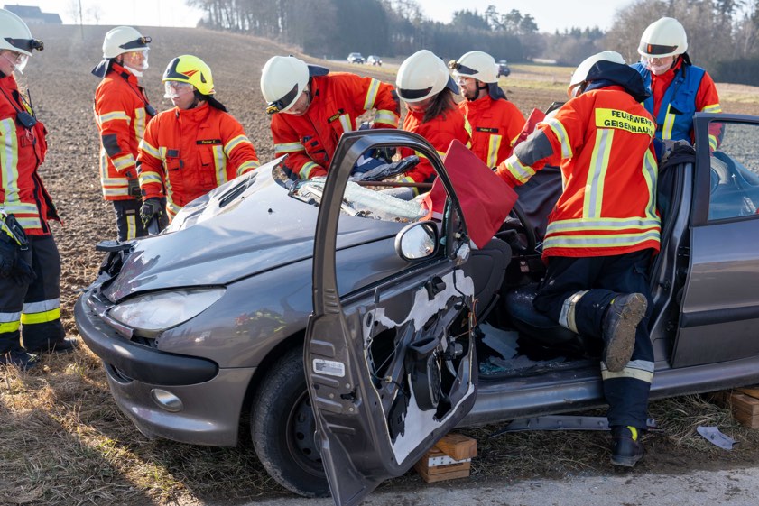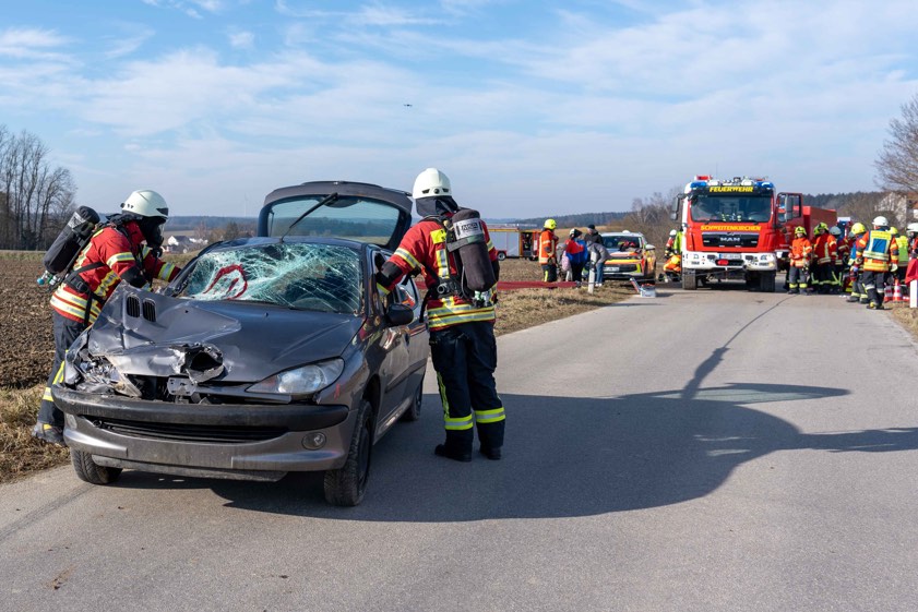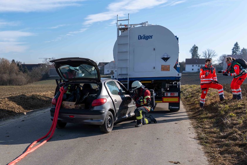 Beim Versuch, sich aus dem Fahrzeug zu befreien, kommt der Fahrer mit der ätzenden Substanz in Kontakt. Seine Beifahrerin ist im Wrack eingeklemmt und erleidet schwere Verletzungen – eine Eisenstange bohrt sich durch ihre Schulter. Gleichzeitig erschwert nicht nur die schmale Nebenstraße zur Staatsstraße 2045 den Zugang für die insgesamt rund 90 Einsatzkräfte, sondern auch der erweiterte Gefahren-Bereich aufgrund des ausgetretenen Gefahrguts.