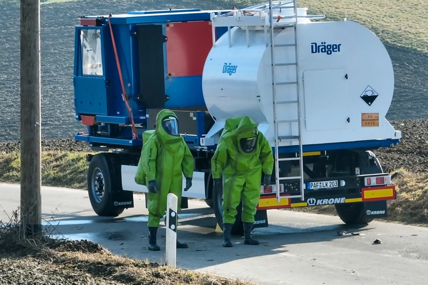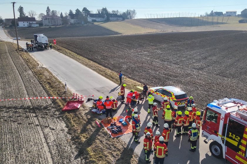 "Das realistisch gestaltete Szenario stellte die Einsatzkräfte vor zahlreiche Herausforderungen", heißt es vom BRK-Kreisverband. Simuliert wurde folgende Situation: Eine Lkw-Fahrerin kollabiert am Steuer ihres Gefahrgut-Transporters, ein nachfolgender Pkw-Lenker kann nicht mehr rechtzeitig bremsen und kracht mit seinem Auto in den Lastwagen. Durch den Aufprall tritt hochkonzentrierte Ameisensäure aus. Doch damit nicht genug.