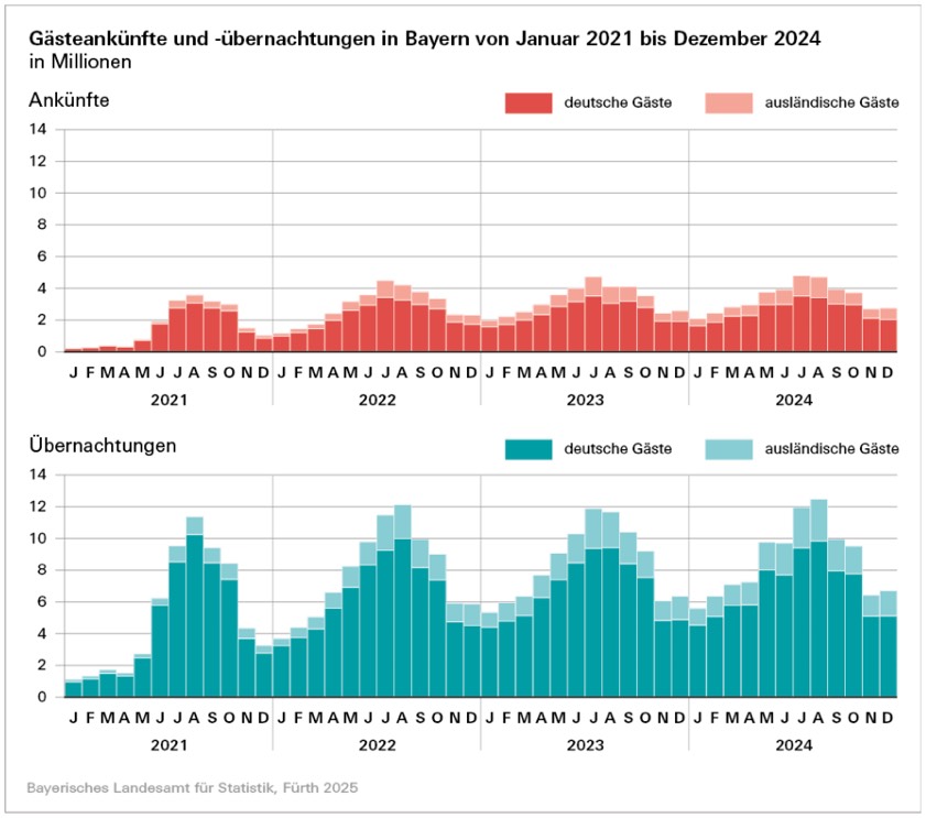 Die Beliebtheit des Freistaats bei inländischen Gästen (mit Wohnsitz in Deutschland) blieb im vergangenen Jahr ungebrochen. Mit nahezu 31,0 Millionen Ankünften und rund 82,0 Millionen Übernachtungen übertrafen sie das bisherige Rekord-Niveau aus dem Jahr 2023 (Ankünfte: 30,0 Millionen; Übernachtungen: 80,7 Millionen). Zudem zog Bayern erneut mehr internationale Gäste an: Im Vergleich zum Vorjahr stieg deren Zahl um 8,9 Prozent auf etwa 9,6 Millionen. Die Zahl der Übernachtungen von Gästen aus dem Ausland erreichten mit einem Plus um 6,3 Prozent nahezu 20,8 Millionen.