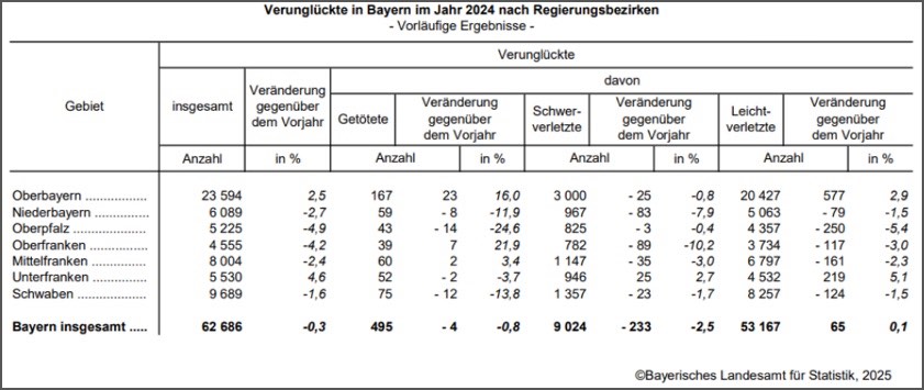 Die Zahl der zugelassenen Kraftfahrzeuge stieg von rund 10,7 Millionen auf rund 10,8 Millionen, was unter anderem auf die wachsende Einwohnerzahl zurückgeführt wird. Die Zahl der bei Verkehrsunfällen Verletzten reduzierte sich von 62 359 auf 62 191. Die Zahl der Schwerverletzten erreichte mit 9024 ein Allzeit-Tief. 495 Menschen kamen im vergangenen Jahr auf bayerischen Straßen ums Leben – vier weniger als im Vorjahr. "Das ist von den beiden Corona-Jahren 2020 und 2021 abgesehen der niedrigste Stand bei der Zahl der Verkehrstoten in Bayern seit Beginn der Unfall-Aufzeichnungen vor 70 Jahren", so Herrmann. "Trotzdem: Jeder Verkehrstote ist einer zu viel."