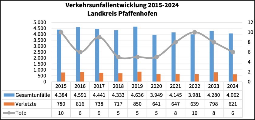 Die Zahl der Verkehrsunfälle im Landkreis Pfaffenhofen, die sich unter Beteiligung eines Fahrers im Alter zwischen 18 und 24 Jahren ereigneten, sank von 316 auf 277. Die Zahl der polizeilich registrierten Unfälle, an denen ein Senior oder eine Seniorin ab einem Alter von 65 Jahren beteiligt waren, reduzierte sich von 328 auf 301. Die Zahl der so genannten Schulweg-Unfälle sank von zehn auf sechs; die Zahl der dabei verletzten Schüler fiel von elf auf fünf.