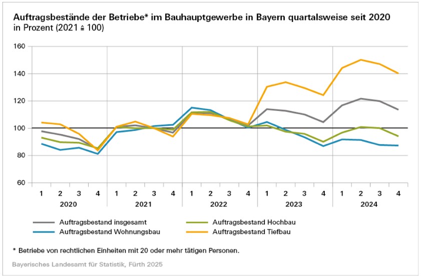 Im Jahresvergleich von Ende Dezember 2024 und 2023 verbuchten der gewerbliche und industrielle Hochbau sowie Tiefbau die höchsten Zuwächse mit 10,1 Prozent beziehungsweise 29,1 Prozent. Der Auftrags-Bestand im Wohnungsbau lag mit einer Steigerung um 0,5 Prozent nominal knapp über Vorjahres-Niveau.
