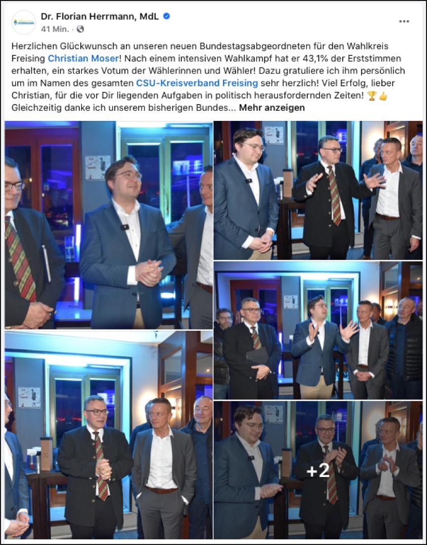 "Anhand der Erstimmen-Ergebnisse der CSU-Wahlkreis-Bewerber steht fest, dass es sicher reichen dürfte", hatte Moser in der Nacht zum heutigen Montag gegenüber unserer Zeitung zu seinem bevorstehenden Einzug in den Bundestag erklärt. Sein Parteifreund Florian Herrmann, Mitglied des bayerischen Landtags, Chef der bayerischen Staatskanzlei und Vorsitzender der Christsozialen im Landkreis Freising, gratulierte Moser zudem bereits öffentlich über "Facebook" (siehe Screenshot unten) und bezeichnete ihn als "neuen Bundestags-Abgeordneten für den Wahlkreis Freising". Dieser Wahlkreis umfasst bekanntlich neben den kompletten Landkreisen Freising und Pfaffenhofen auch Teile des Landkreises Neuburg Schrobenhausen.