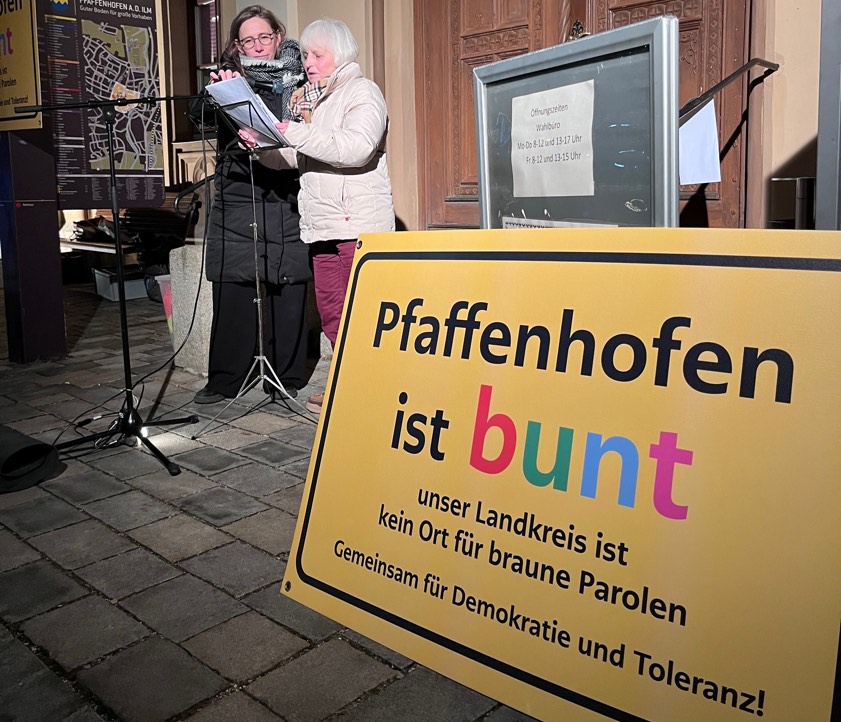 Nach den Redebeiträgen wurden zentrale Artikel des Grundgesetzes verlesen und auf Tafeln aufgestellt – "ein weiteres starkes Symbol für den Schutz demokratischer Grundwerte", heißt es aus dem Bündnis. Musikalisch wurde die Versammlung mit dem Lied "PAF ist bunt" von Barbara Tanze eröffnet. Karin Hoisl-Schmidt von der Band "Schmidteinand" aus Ilmmünster konnte krankheitsbedingt nicht live auftreten. Doch ihre Lieder "Ruck ma wieda zam" – ein Aufruf, in den Dialog zu treten – sowie "Der Ring" – das sich mit dem Schicksal ihres im Zweiten Weltkrieg gefallenen Großvaters auseinandersetzt und für ein "Nie wieder!" eintritt – gab es trotzdem zu hören. Nach Dafürhalten von "Pfaffenhofen ist bunt" setzte diese Veranstaltung "ein eindrucksvolles Zeichen für eine offene, demokratische und solidarische Gesellschaft".