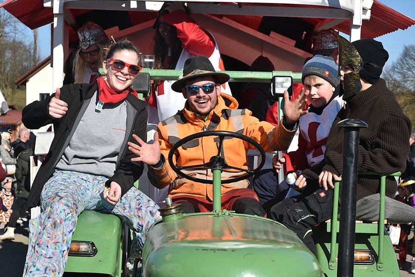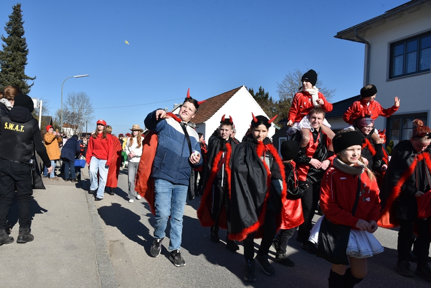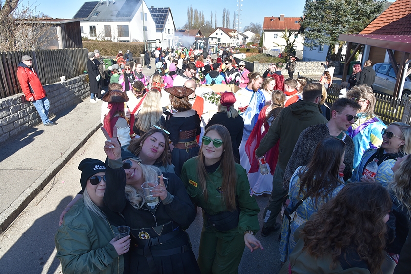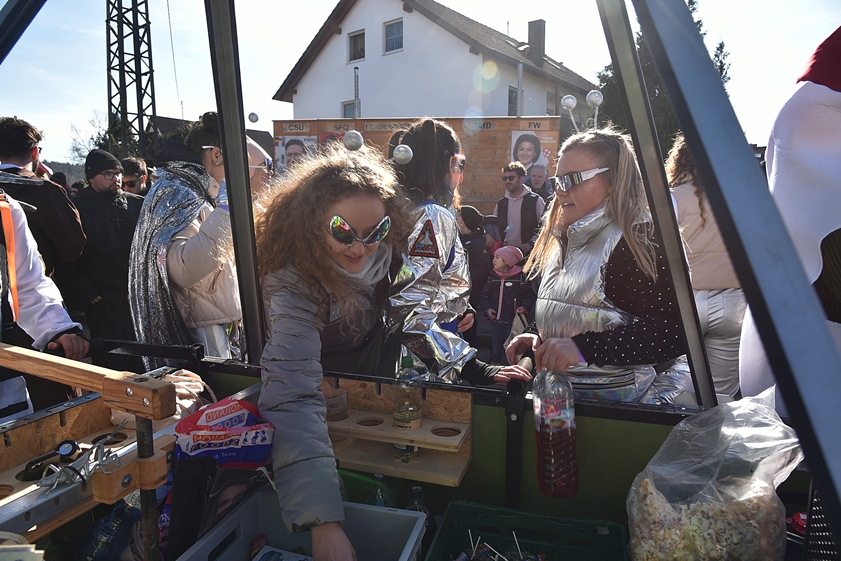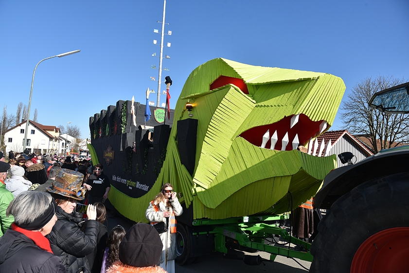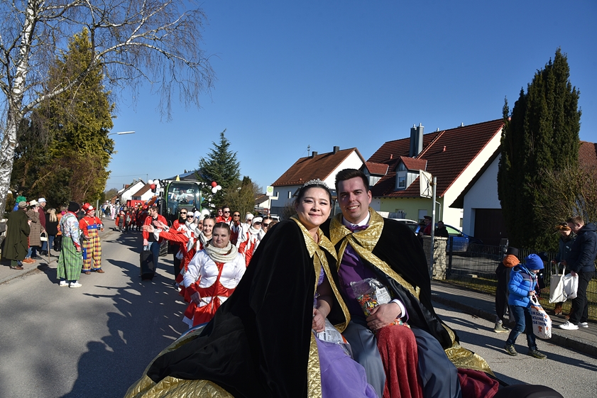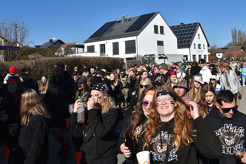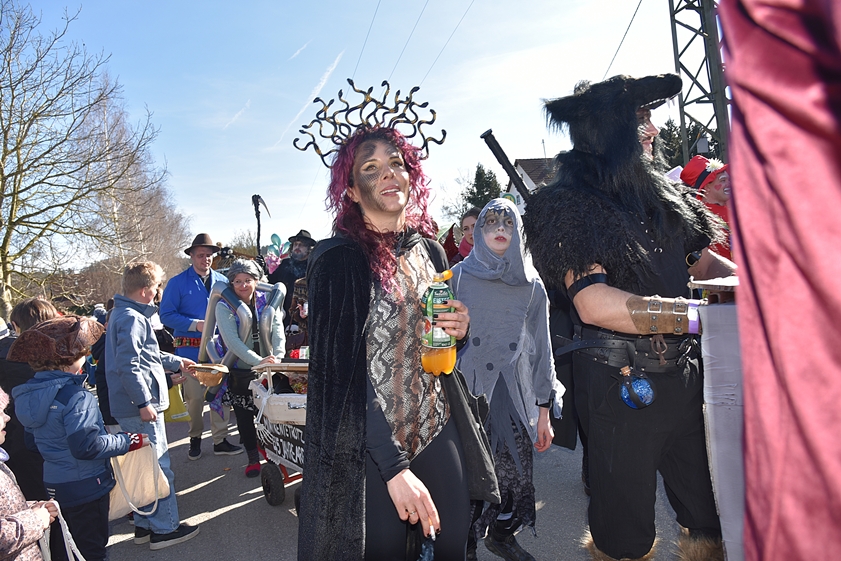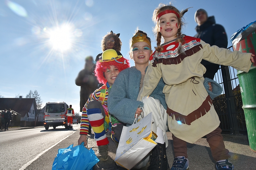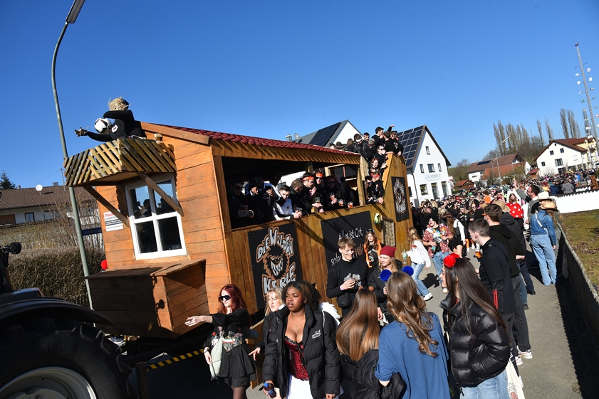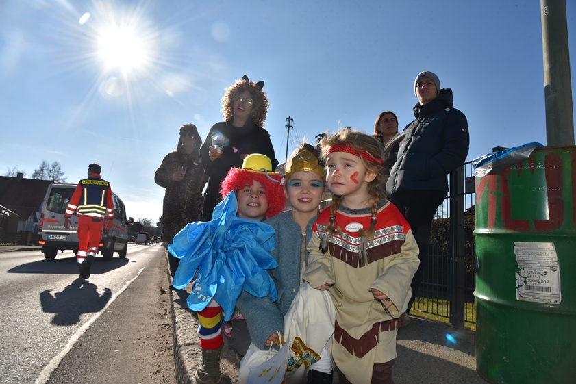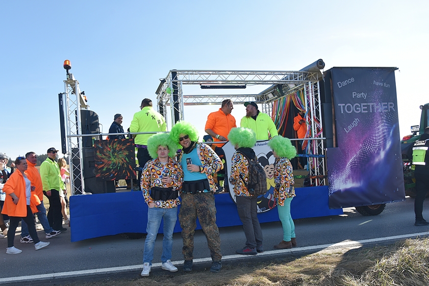 Zahlreiche Zuschauer verfolgten das närrische Spektakel, an dem etliche Wagen und viele Fußgruppen beteiligt waren. Der Tag klingt mit einer Party aus.