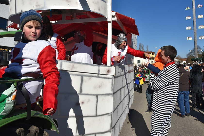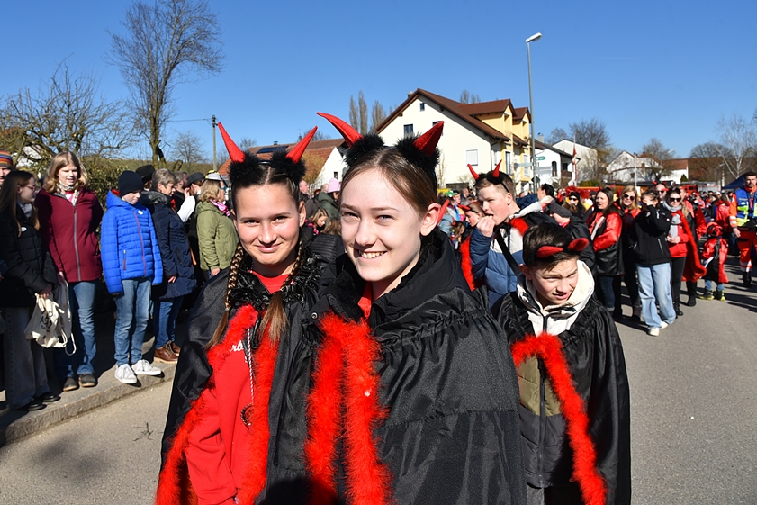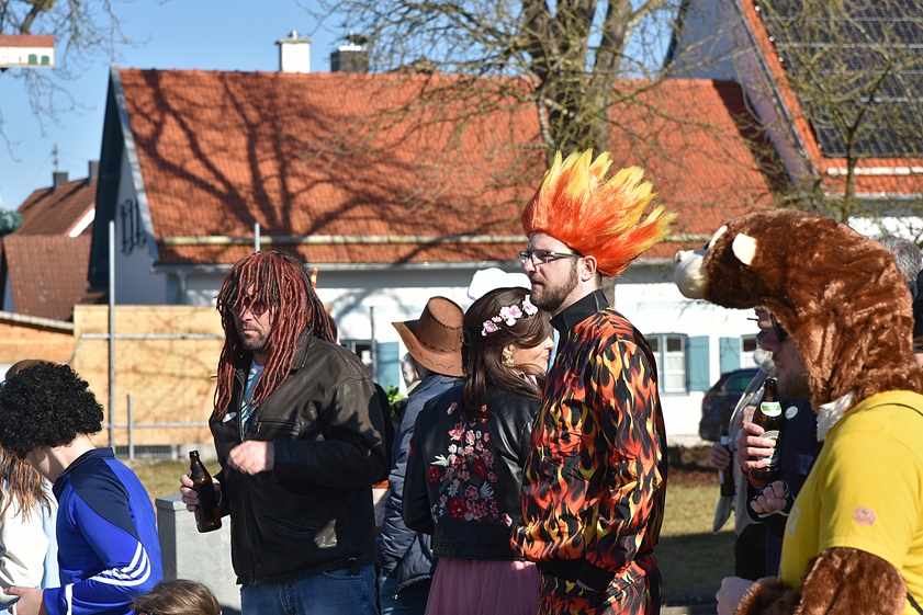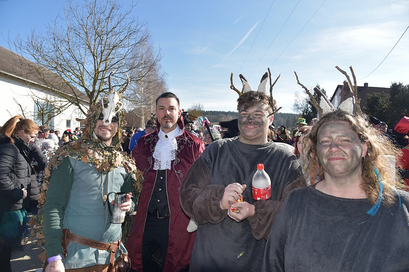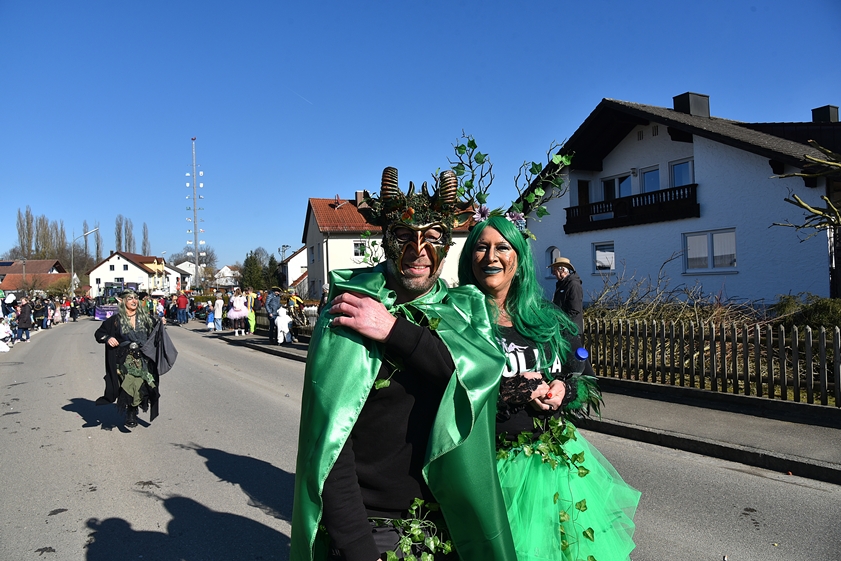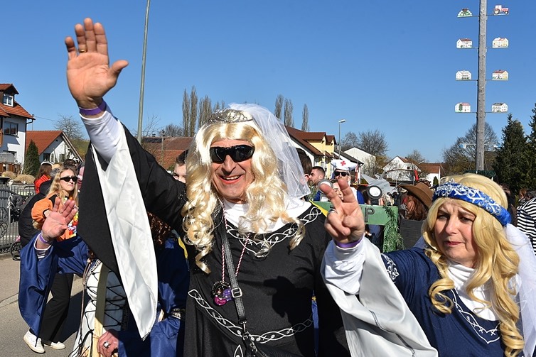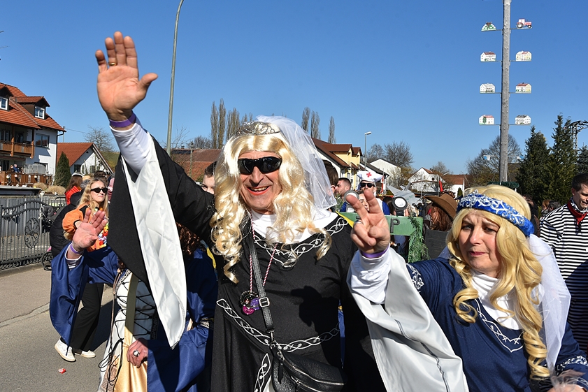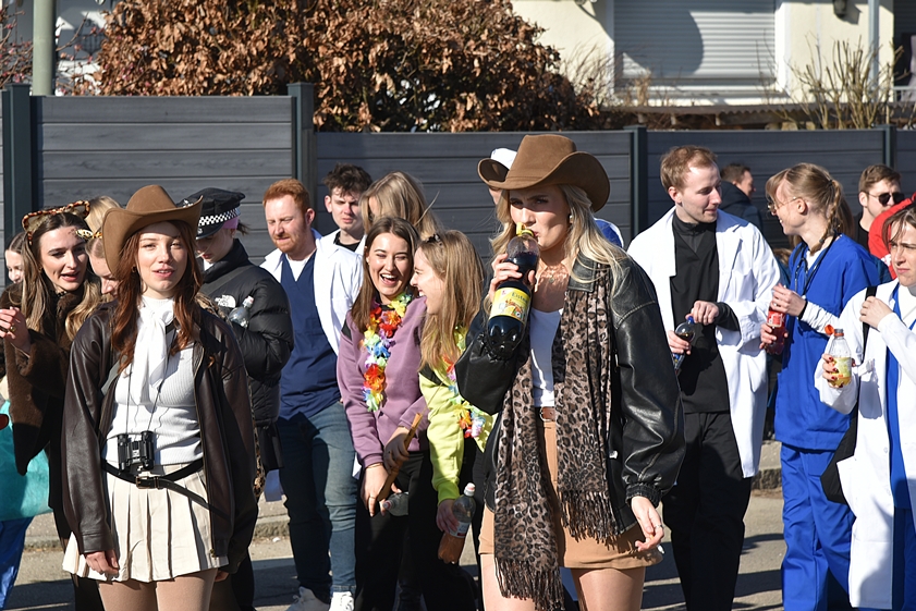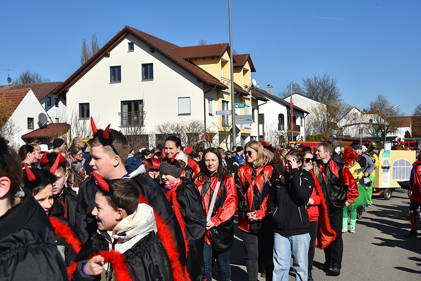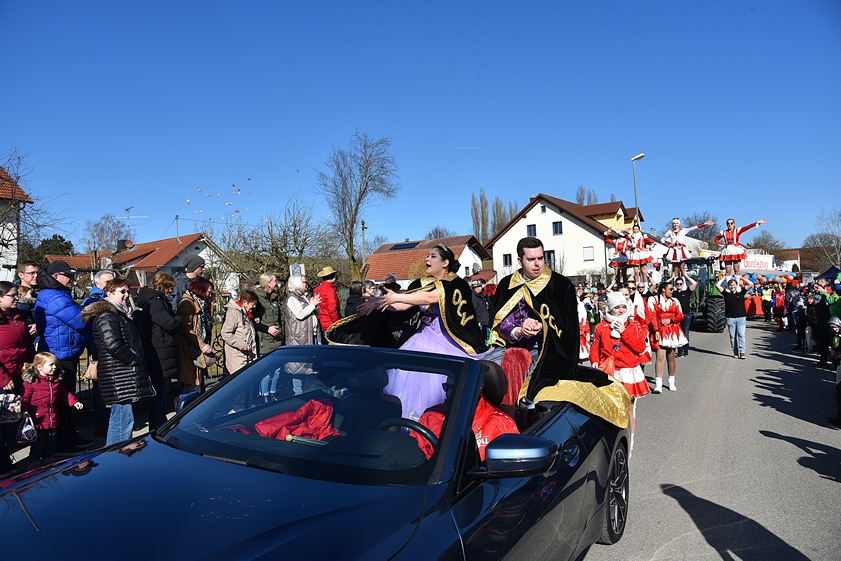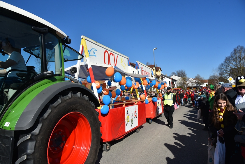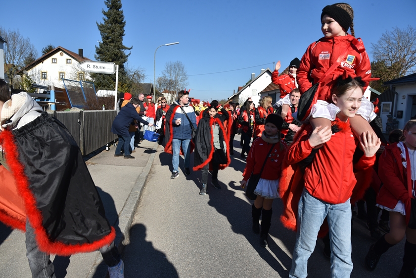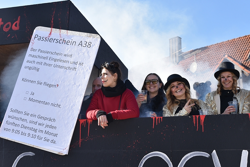 Zahlreiche Zuschauer verfolgten das närrische Spektakel, an dem etliche Wagen und viele Fußgruppen beteiligt waren. Der Tag klingt mit einer Party aus.