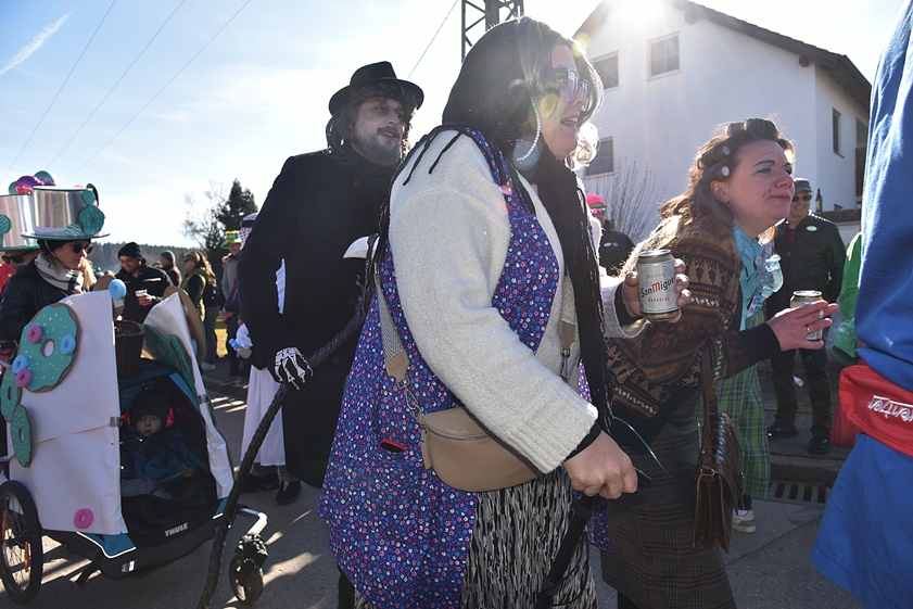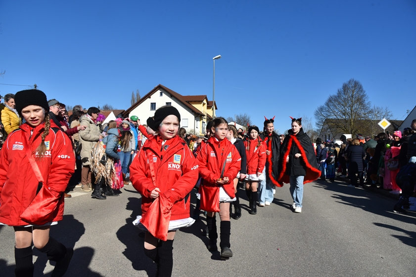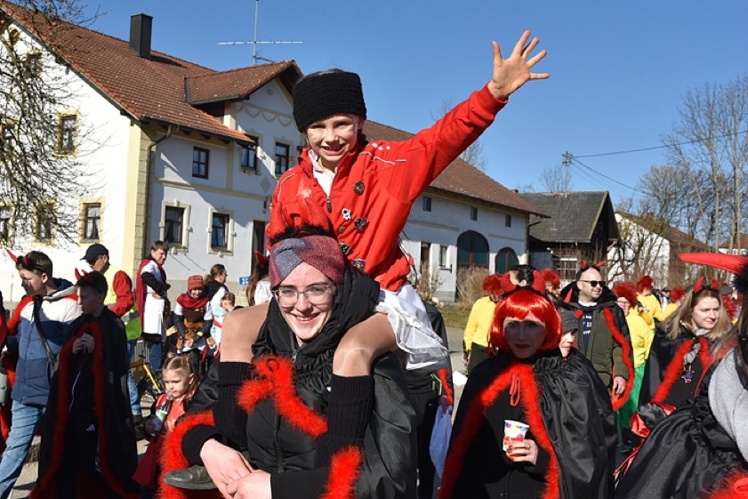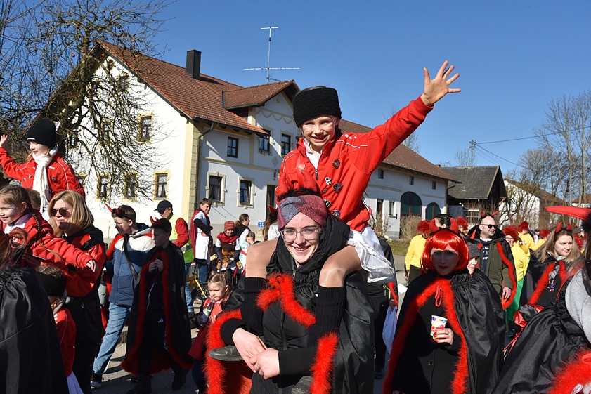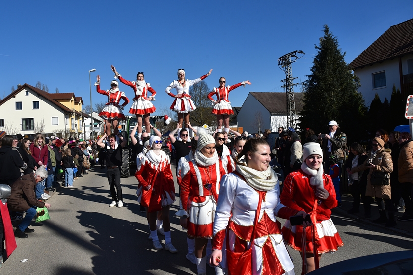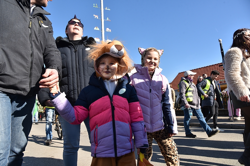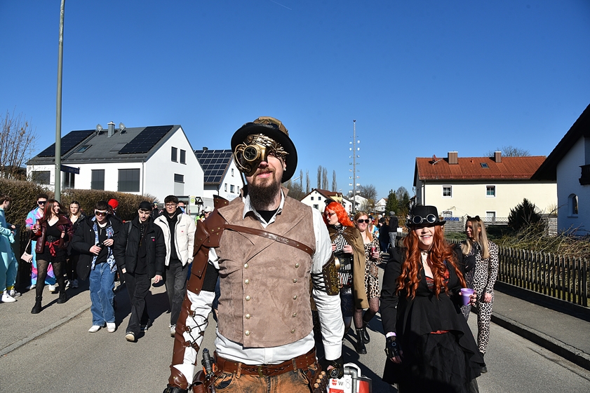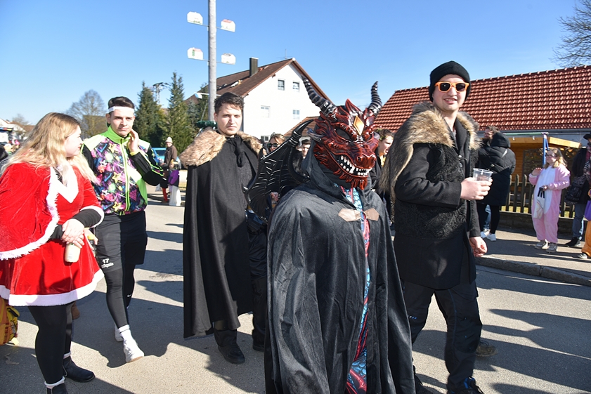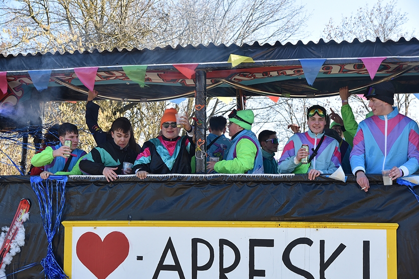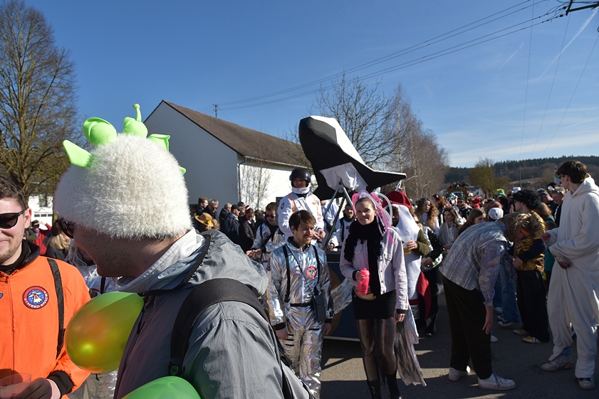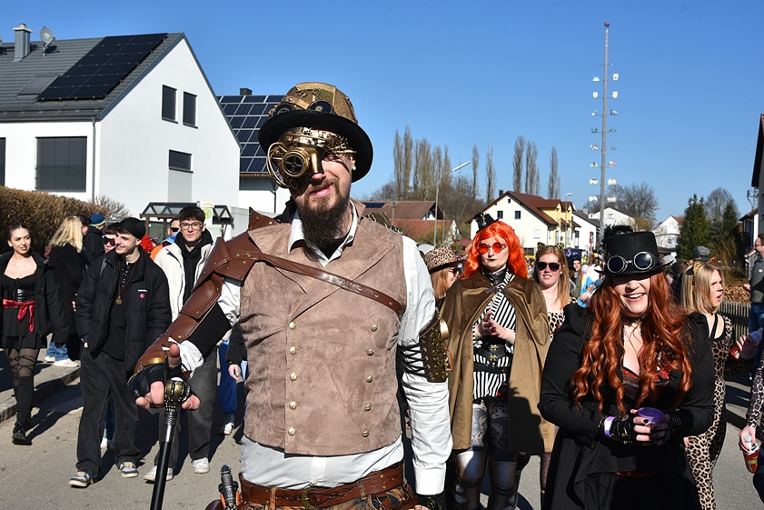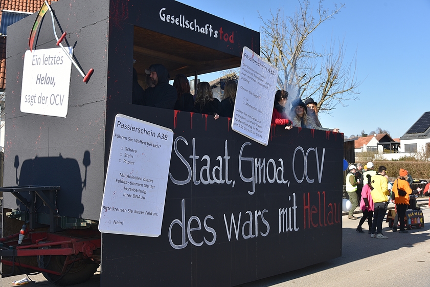 Zahlreiche Zuschauer verfolgten das närrische Spektakel, an dem etliche Wagen und viele Fußgruppen beteiligt waren. Der Tag klingt mit einer Party aus.