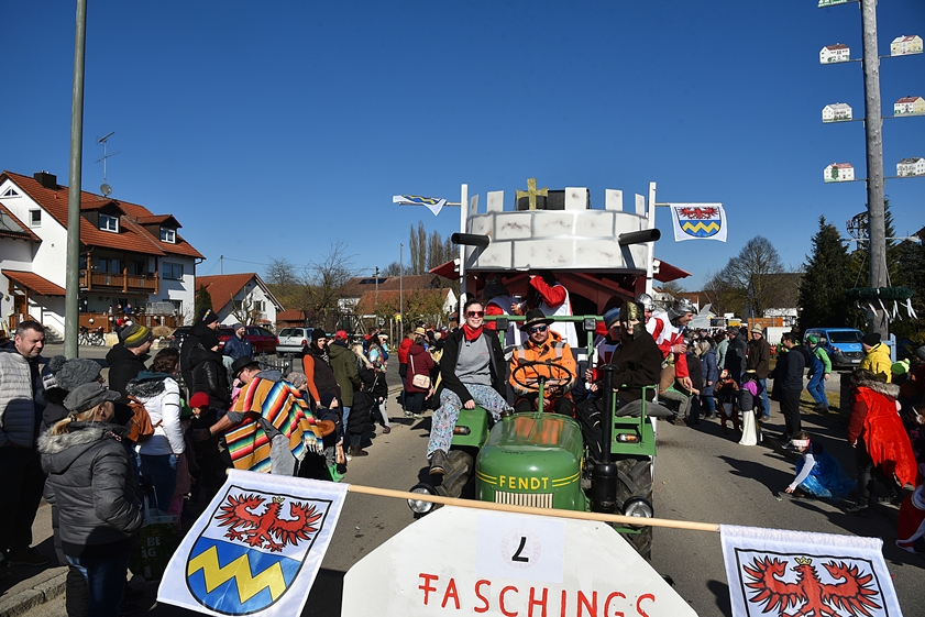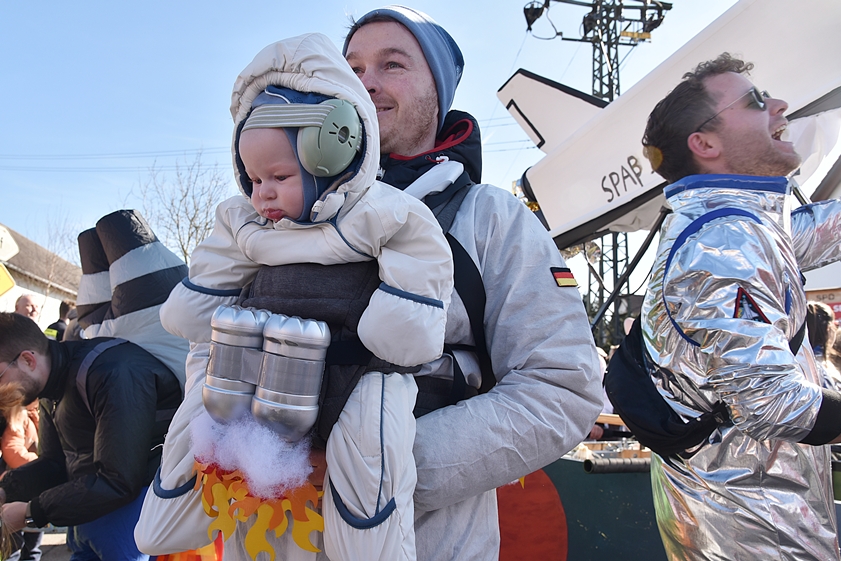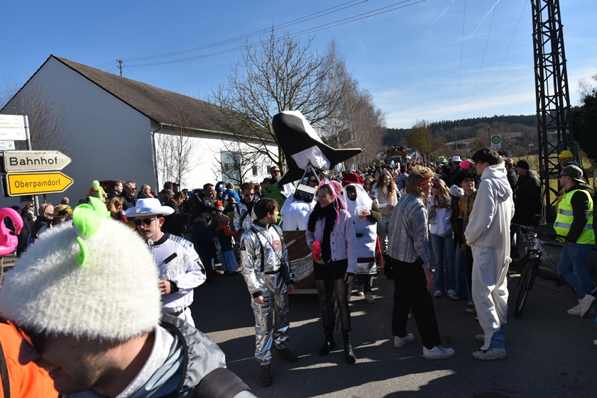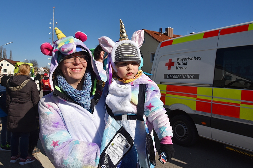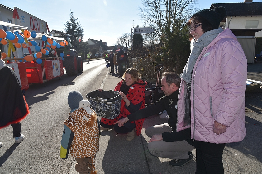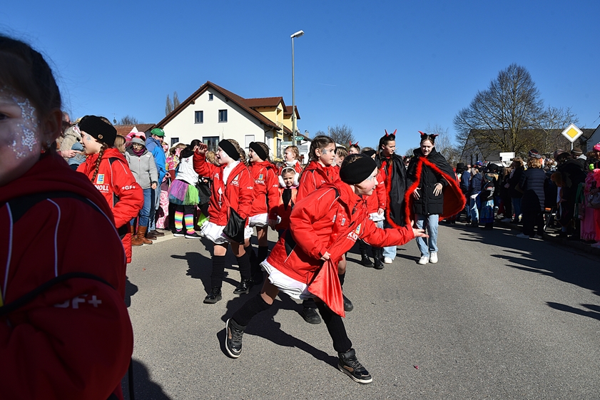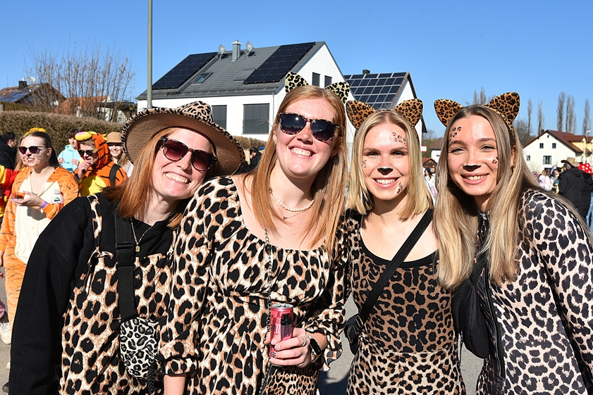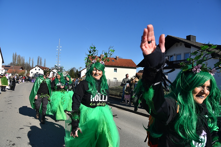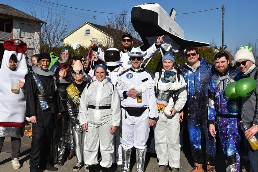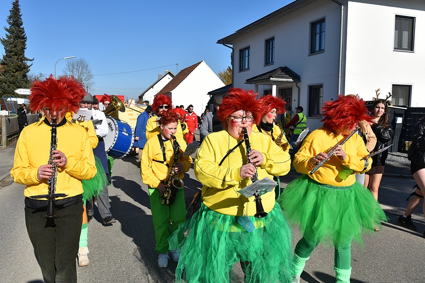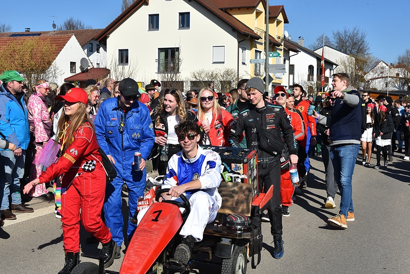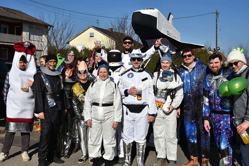 Zahlreiche Zuschauer verfolgten das närrische Spektakel, an dem etliche Wagen und viele Fußgruppen beteiligt waren. Der Tag klingt mit einer Party aus.